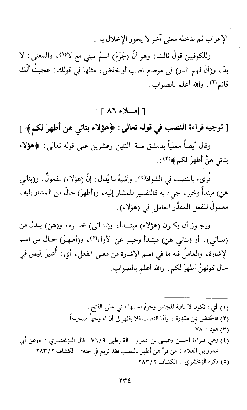 وقال أيضاً مملياً بدمشق سنة اثنتين وعشرين على قوله تعالى: {هؤلاء بناتي هن أطهر لكم} (¬3): قرئ بالنصب في الشواذ (¬4). وأشبه ما يقال: إن (هؤلاء) مفعول، و (بناتي هن) مبتدأ وخبر، جيء به كالتفسير للمشار إليه، و (أطهر) حال من المشار إليه، معمول للفعل المقدر العامل في (هؤلاء).