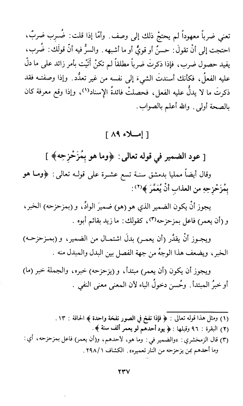 (¬3) قال الزمخشري: "والضمير في: وما هو، لأحدهم، و (أن يعمر) فاعل بمزحزحه، أي: وما أحدهم بمن يزحزحه من النار تعميره". الكشاف 1/ 298.