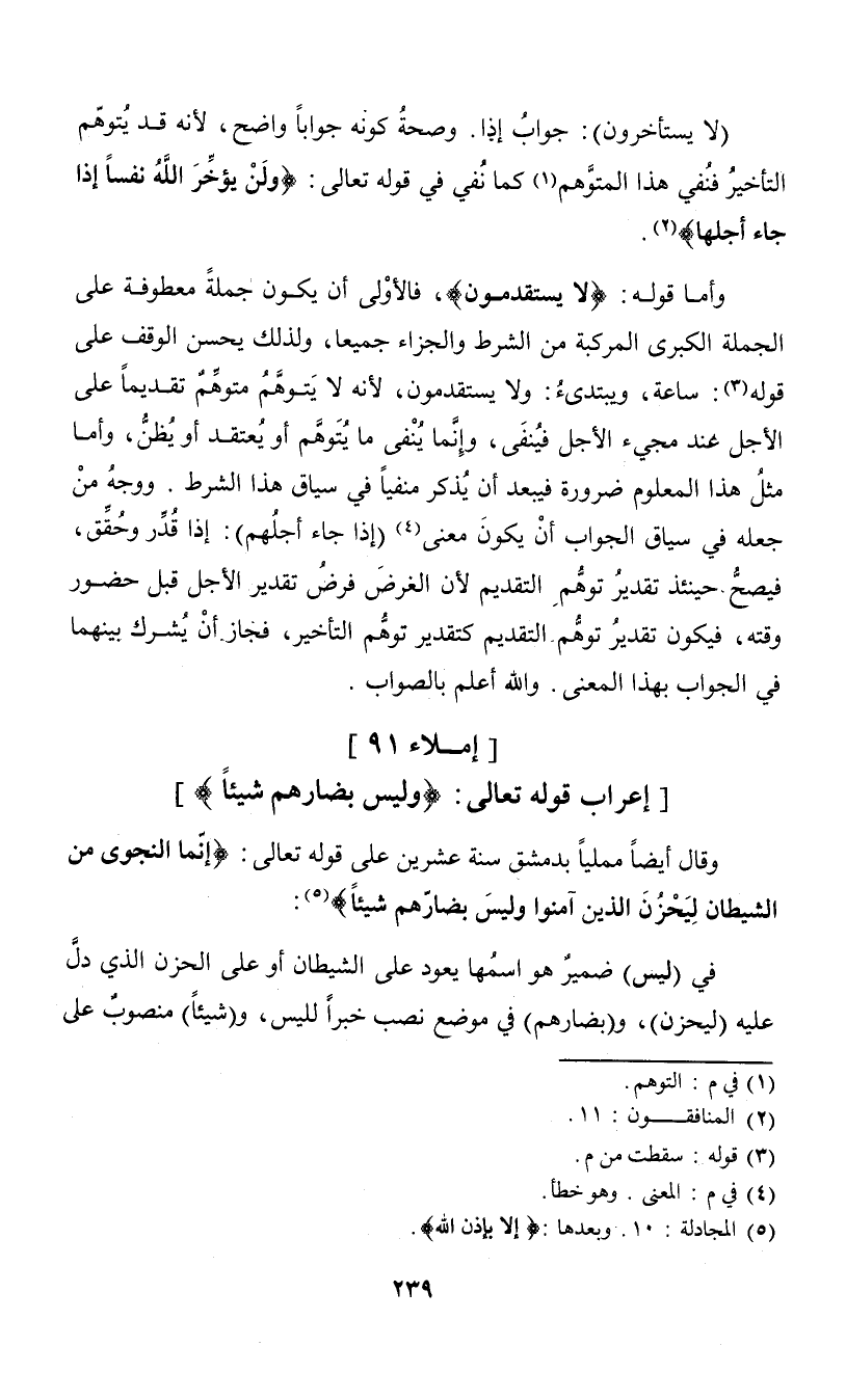 وقال أيضاً مملياً بدمشق سنة عشرين على قوله تعالى: "إنما النجوى من الشيطان ليحزن الذين آمنوا وليس بضارهم شيئا" (¬5):