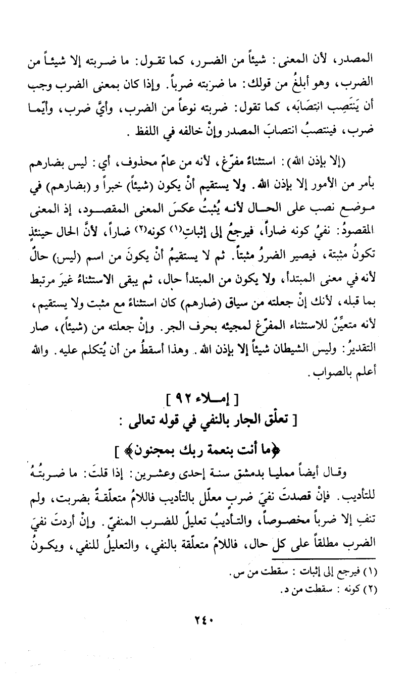 وقال أيضاً مملياً بدمشق سنة إحدى وعشرين: إذا قلت: ما ضربته للتأديب. فإن قصدت نفي ضرب معلل بالتأديب فاللام متعلقة بضربت، ولم تنف إلا ضرباً مخصوصاً، والتأديب تعليل للضرب المنفي. وإن أردت نفي الضرب مطلقاً على كل حال، فاللام متعلقة بالنفي، والتعليل للنفي، ويكون