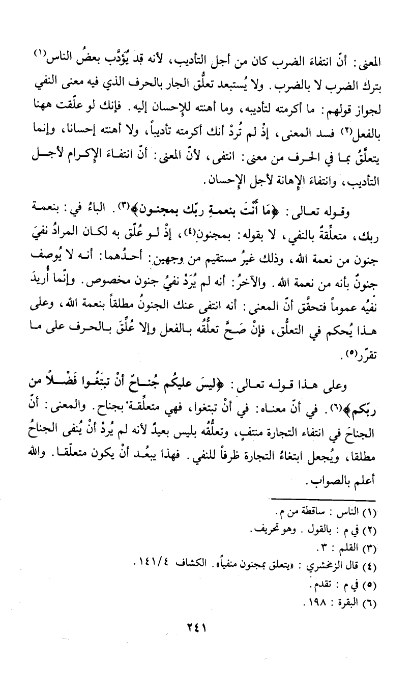 المعنى: أن انتفاء الضرب كان من أجل التأديب، لأنه قد يؤدب بعض الناس (¬1) بترك الضرب لا بالضرب. ولا يستبعد تعلق الجال بالحرف الذي فيه معنى النفي لجواز قولهم: ما أكرمته لتأديبه، وما أهنته للإحسان إليه. فإنك لو علقت ههنا بالفعل (¬2) فسد المعنى، إذ لم ترد أنك أكرمته تأديبا، ولا أهنته إحساناً، وإنما يتعلق بما في الحرف من معنى: انتفى، لأن المعنى: أن انتفاء الإكرام لأجل التأديب، وانتفاء الإهانة لأجل الإحسان. وقوله تعالى: {ما أنت بنعمة ربك بمجنون} (¬3). الباء في: بنعمة ربك، متعلقة بالنفي، لا بقوله: بمجنون (¬4)، إذ لو علق به لكان المراد نفي جنون من نعمة الله، وذلك غير مستتقيم من وجهين: أحدهما: أنه لا يوصف جنون بأنه من نعمة الله. والآخر: أنه لم يرد نفي جنون مخصوص. وإنما أريد نفيه عموماً فتحقق أن المعنى: أنه انتفى عنك الجنون مطلقاً بنعمة الله، وعلى هذا يحكم في التعلق، فإن صح تعلقه بالفعل وإلا علق بالحرف على ما تقرره (¬5).