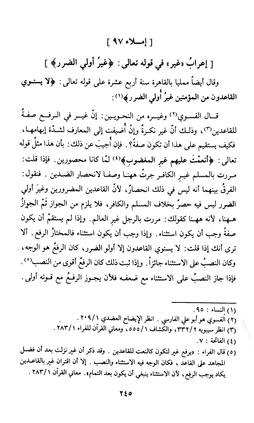 (¬5) قال الفراء: "يرفع غير لتكون كالنعت للقاعدين. وقد ذكر أن غير نزلت بعد أن فضل المجاهد على القاعد، فكان الوجه فيه الاستثناء والنصب. إلا أن اقتران غير بالقاعدين يكاد يوجب الرفع، لأن الاستثناء ينبغي أن يكون بعد التمام". معاني القرآن 1/ 283.