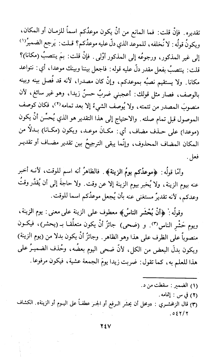 تقديره. فإن قلت: فما المانع من أن يكون موعدكم اسما للزمان أو المكان، ويكون قوله: لا نخلفه، للموعد الذي دل عليه موعدكم؟ قلت: يرجع الضمير (¬1) إلى غير المذكور، ورجوعه إلى المذكور أولى. فإن قلت: بم ينتصب (مكاناً)؟ قلت: ينتصب بفعل مقدر دل عليه قوله: فاجعل بيننا وبينك موعدا، أي: نتواعد مكاناً. ولا يستقيم نصبه بموعدكم، وإن كان مصدرا، لأنه قد فصل بينه وبينه بالوصف، فصار مثل قولك: أعجبني ضرب حسن زيدا، وهو غير سائغ، لأن منصوب المصدر من تتمته، ولا يوصف الشيء إلا بعد تمامه (¬2)، فكان كوصف الموصول قبل تمام صلته. والاحتياج إلى هذا التقدير هو الذي يحسن أن يكون (موعدا) على حذف مضاف، أي: مكان موعد، ويكون (مكاناً) بدلا من المكان المضاف المحذوف، وإنما يبقى الترجيح بين تقدير مضاف أو تقدير فعل. وأما قوله: {موعدكم يوم الزينة}. فالظاهر أنه اسم للوقت، لأنه أخبر عنه بيوم الزينة، ولا يخبر بيوم الزينة إلا عن وقت. ولا حاجة غلى أن يقدر وقت وعدكم، لأنه تقدير مستغنى عنه بأن يجعل موعدكم اسما للوقت. وقوله: {أن يحشر الناس} معطوف على الزينة على معنى: يوم الزينة، ويوم حشر الناس (¬3). و (ضحى) جائز أن يكون متعلقا بـ (يحشر)، فيكون منصوباً على الظرف على هذا وهو الظاهر. وجائز أن يكون بدلا من (يوم الزينة) ويكون بدل البعض من الكل، لأن ضحى اليوم بعضه، وحذف الضمير على هذا للعلم به، كما تقول: ضربت زيدا يوم الجمعة عشية، فيكون مرفوعاً.