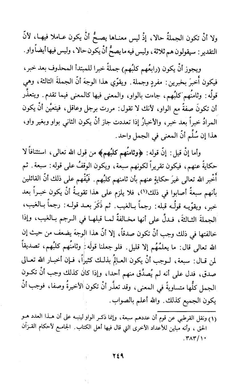 ويجوز أن يكون (رابعهم كلبهم) جملة خبرا للمبتدأ المحذوف بعد خبر، فيكون أخبر بخبرين: مفرد وجملة. ويقوي هذا الوجه أن الجملة الثالثة، وهي قوله: وثامنهم كلبهم، جاءت بالواو، والمعنى فيها كالمعنى فيما تقدم. ويتعذر أن تكون صفة مع الواو، لأنك لا تقول: مررت برجل وعاقل، فيتعين أن يكون المراد خبراً بعد خبر، والأخبار إذا تعددت جاز أن يكون الثاني بواو وبغير واو، هذا إن سلم أن المعنى في الجمل واحد. وأما إن قيل: إن قوله: {وثامنهم كلبهم} من قول الله تعالى، استئنافاً لا حكاية عنهم، فيكون تقريراً لكونهم سبعة، ويكون الوقف على قوله: سبعة. ثم أخبر الله تعالى غير حكاية عنهم بأن ثامنهم كلبهم. فيفهم على ذلك أن القائلين بأنهم سبعة أصابوا في ذلك (¬1)، فلا يلزم على هذا تقوية أن يكون خبراً بعد خبر، يقويه قوله قبله: رجماً بالغيب. ثم ذكر بعد قوله: رجما بالغيب، الجملة الثالثة، فدل على أنها مخالفة لما قبلها في الرجم بالغيب، وإذا خالفتها في ذلك وجب أن تكون صدقاً، إلا أن هذا الوجه يضعف من حيث إن الله تعالى قال: ما يعلمهم إلا قليل. فلو جعلنا قوله: وثامنهم كلبهم، تصديقا لمن قال: سبعة، لوجب أن يكون العالم بذلك كثيراً، فإن أخبار الله تعالى صدق، فدل على أنه لم يصدق منهم أحدا، وإذا كان كذفك وجب أن تكون الجمل كلها متساوية في المعنى، وقد تعذر أن تكون الأخيرة وصفا، فوجب أن يكون الجميع كذلك. والله أعلم بالصواب.