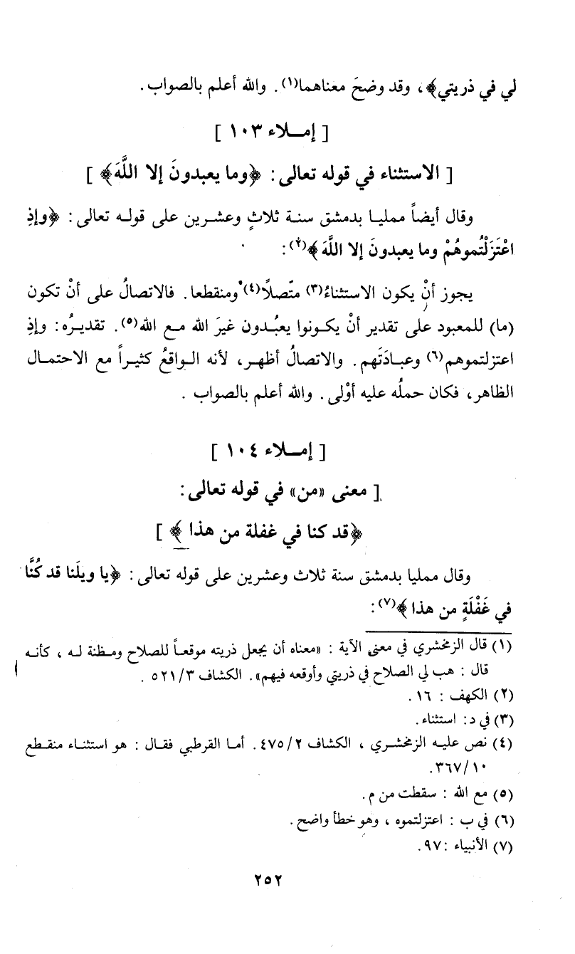 وقال أيضاً ممليا بدمشق سنة ثلاث وعشرين على قوله تعالى: {وإذ اعتزلتموهم وما يعبدون إلا الله} (¬2): يجوز أن يكون الاستثناء (¬3) متصلاً (¬4) ومنقطعاً. فالاتصال على أن تكون (ما) للمعبود على تقدير أن يكونوا يعبدون غير الله مع الله (¬5). تقديره: وإذ اعتزلتموهم (¬6) وعبادتهم. والاتصال أظهر، لأنه الواقع كثيراً مع الاحتمال الظاهر، فكان حمله عليه أولى. والله أعلم بالصواب.