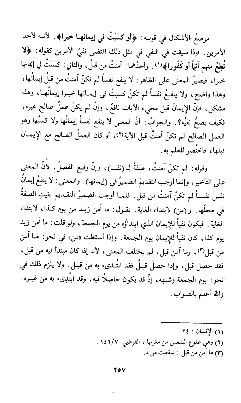 وقوله: لم تكن آمنت، صفة لـ (نفسا)، وإن وقع الفصل، لأن المعنى على التأخير، وإنما أوجب التقديم الضمير في (إيمانها). والمغني: لا ينفع إيمان نفس نفساً لم تكن آمنت من قبل. فلما أوجب الضمير التقديم بقيت الصفة في محلها. و (من) لابتداء الغاية. تقول: ما آمن زيد من يوم كذا، لابتداء الغاية. فيكون نفياً للإيمان الذي ابتداؤه من يوم الجمعة، ولو قلت: ما آمن زيد يوم كذا، كان نفياً للإيمان يوم الجمعة. وإذا أسقطت "من" في نحو: ما آمن من قبل (¬3)، وما آمن قبل، لم يختلف المعنى، لأنه إذا كان مبتدأ فيه من قبل، فقد حصل قبل، وإذا حصل قبل فقد ابتدئ به من قبل. ولا يلزم ذلك في نحو: يوم الجمعة وشبهه، إذ قد يكون حاصلاً فيه، وقد ابتدئ به من غيره. والله أعلم بالصواب.