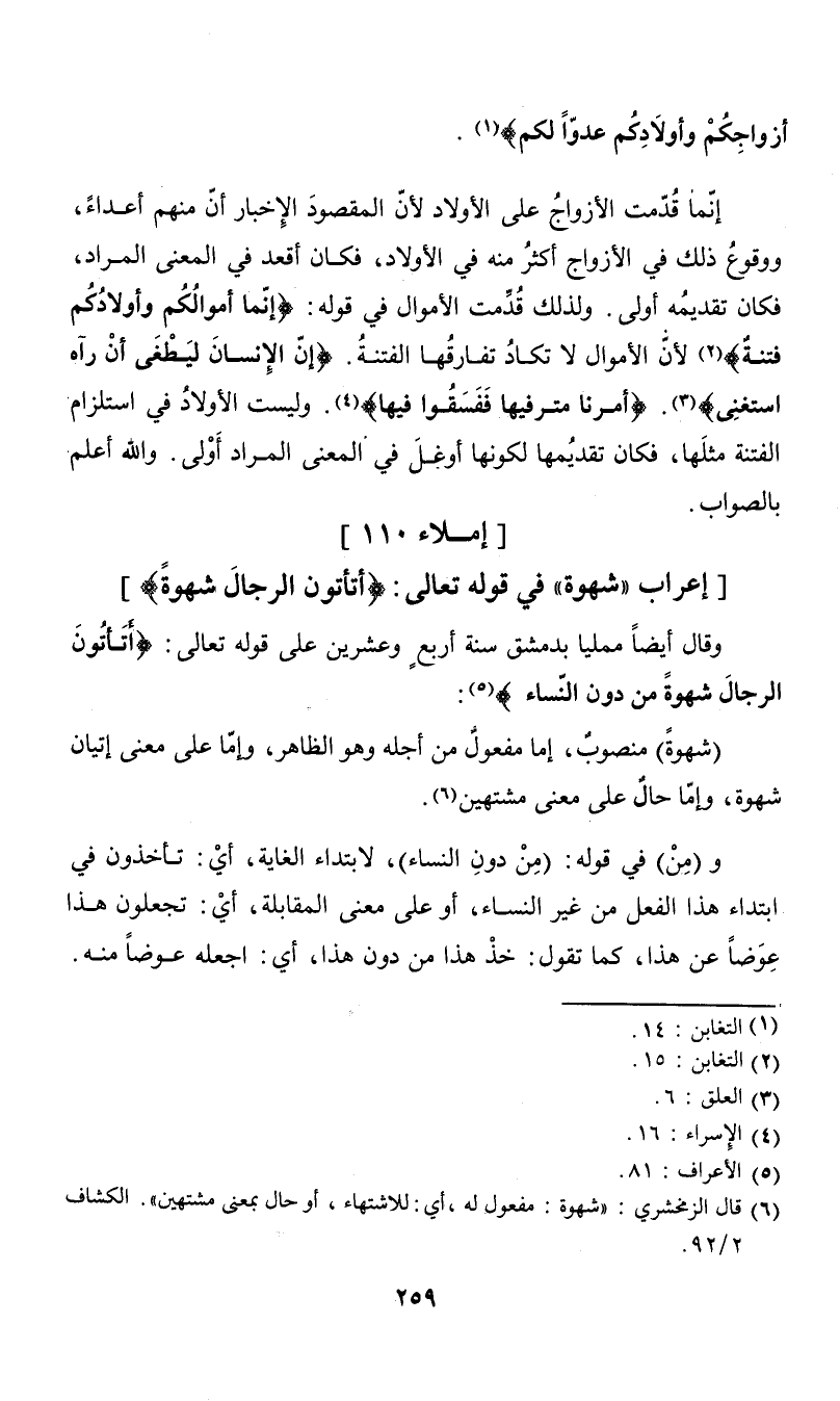 وقال أيضاً ممليا بدمشق سنة أربع وعشرين على قوله تعالى: {أتأتون الرجال شهوة ن دون النساء} (¬5): (شهوة) منصوب، إما مفعول من أجله وهو الظاهر، وإما على معنى إتيان شهوة، وإما حال على معنى مشتهين (¬6). و (من) في قوله: (من دون النساء)، لابتداء الغاية، أي: تأخذون في ابتداء هذا الفعل من غير النساء، أو على معنى المقابلة، أي: تجعلون هذا عوضاً عن هذا، كما تقول: خذ هذا من دون هذا، أي: اجعله عوضاً منه.