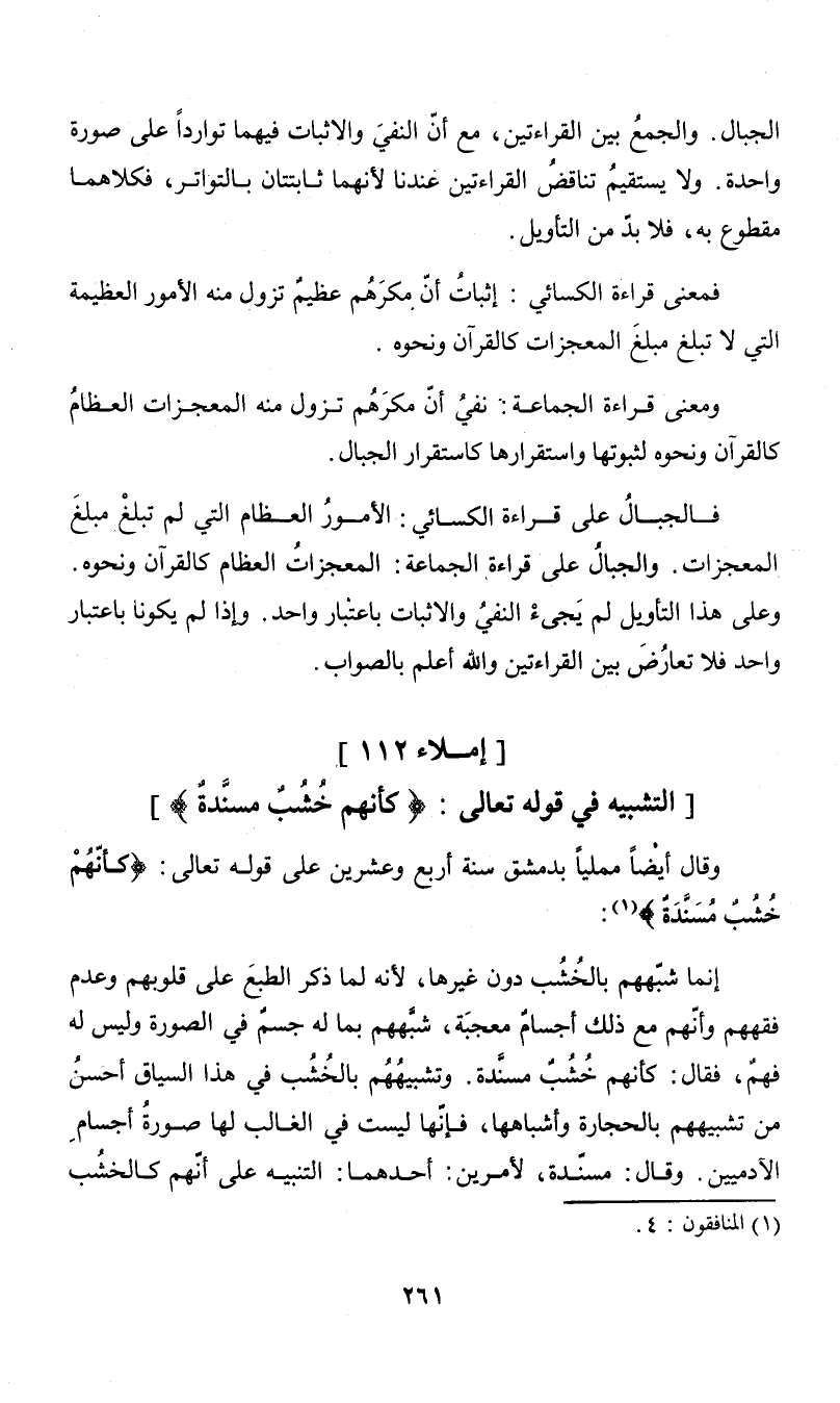وقال أيضاً مملياً بدمشق سنة أربع وعشرين على قوله تعالى: {كأنهم خشب مسندة} (¬1):