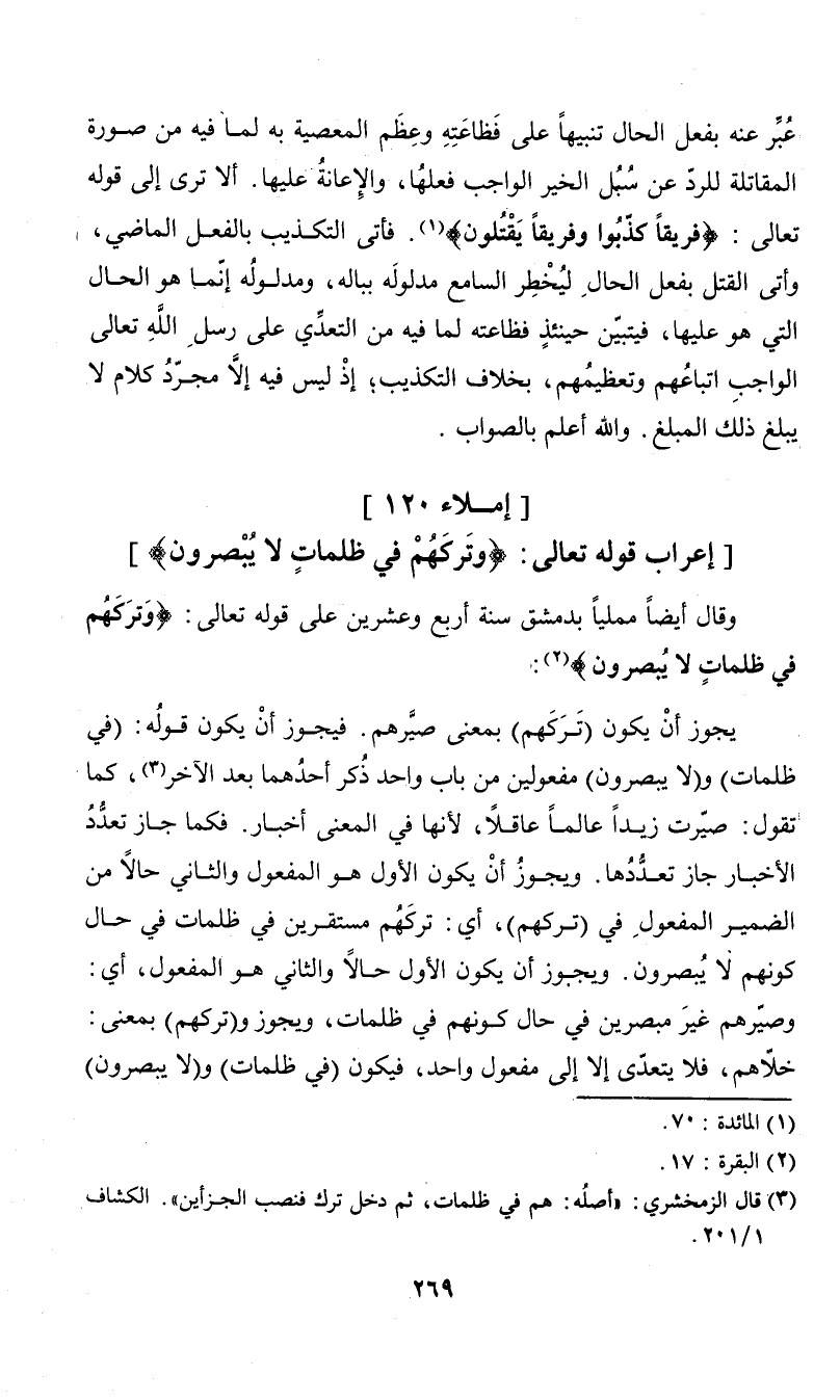 وقال أيضاً مملياً بدمشق سنة أربع وعشرين على قوله تعالى: {وتركهم في ظلمات لا يبصرون} (¬2).