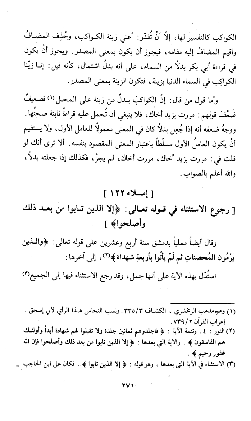 (¬3) الاستثناء في الآية التي بعدها، وهو قوله: "إلا الذين تابوا". فكان علي ابن الحاجب أن يأتي أيضاً بالآية التي بعدها، حتى يكون كلامه واضحاً، غير مبهم.