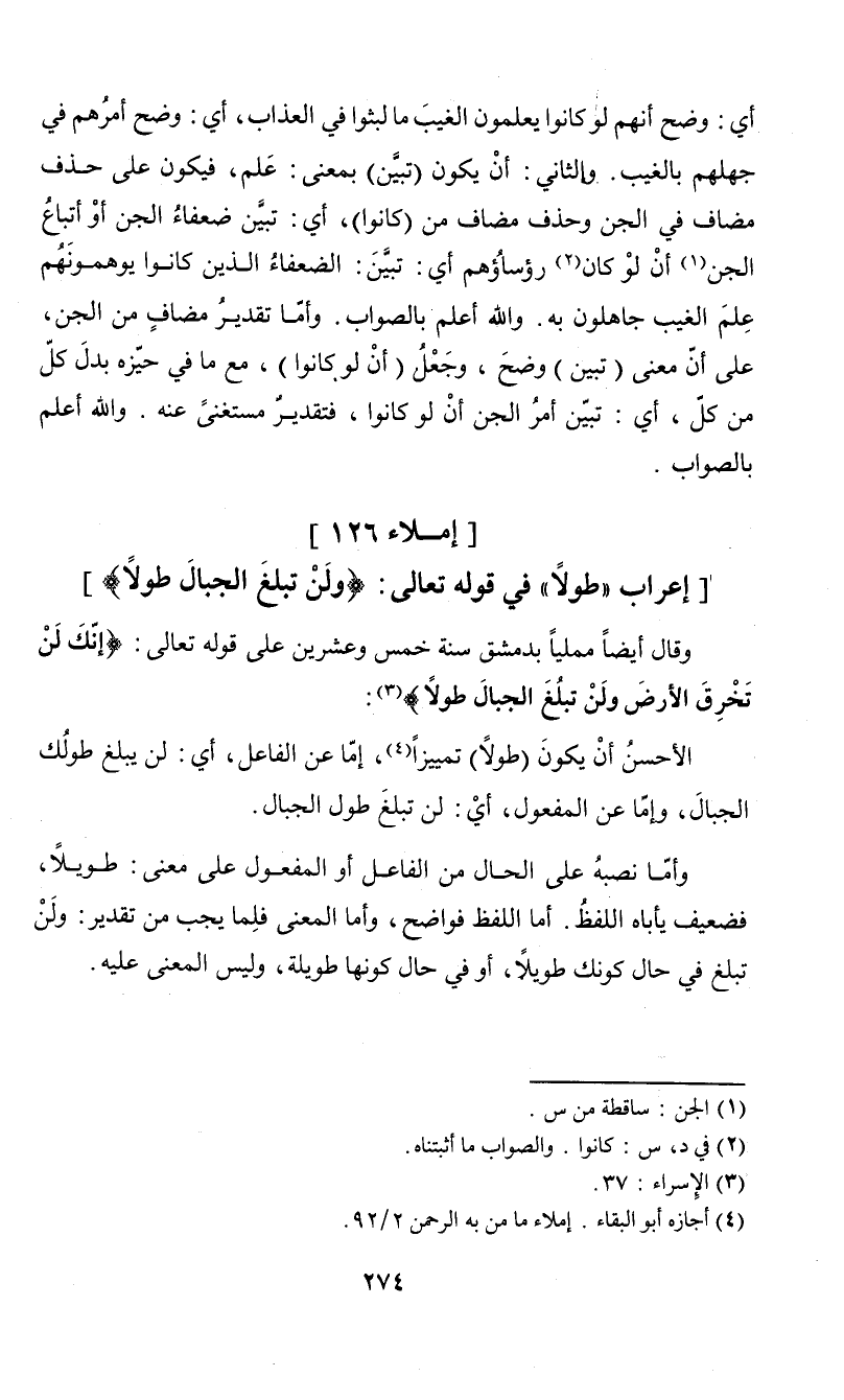 وأما نصبه على الحال من الفاعل أو المفعول على معنى: طويلاً، فضعيف يأباه اللفظ. أما اللفظ فواضح، وأما المعنى فلما يجب من تقدير: ولن تبلغ في حال كونك طويلاً، أو في حال كونها طويلة، وليس المعنى عليه.