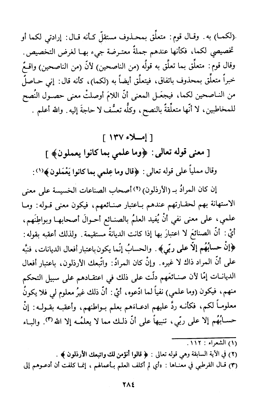 وقال مملياً على قوله تعالى: {قال وما علمي بما كانوا يعملون} (¬1):