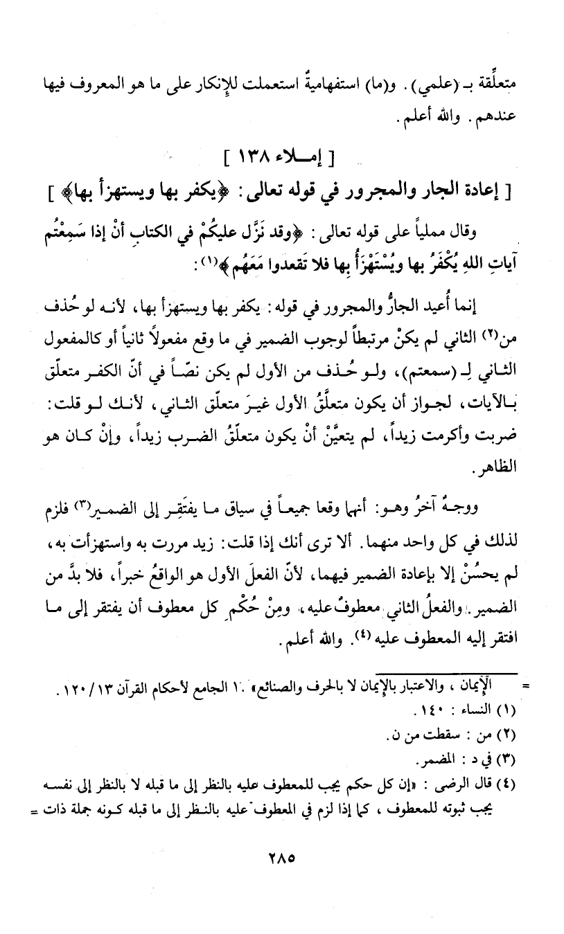 إنما أعيد الجار والمجرور في قوله: يكفر بها ويستهزأ بها، لأنه لو حذف من (¬2) الثاني لم يكن مرتبطاً لوجوب الضمير في وما وقع مفعولاً ثانيا أو كالمفعول الثاني لـ (سمعتم)، ولو حذف من الأول لم يكن نصاً في أن الكفر متعلق بالآيات، لجواز أن يكون متعلق الأول غير متعلق الثاني، لأنك لو قلت: ضربت وأكرمت زيداً، لم يتعين أن يكون متعلق الضرب زيدا، وإن كان هو الظاهر.