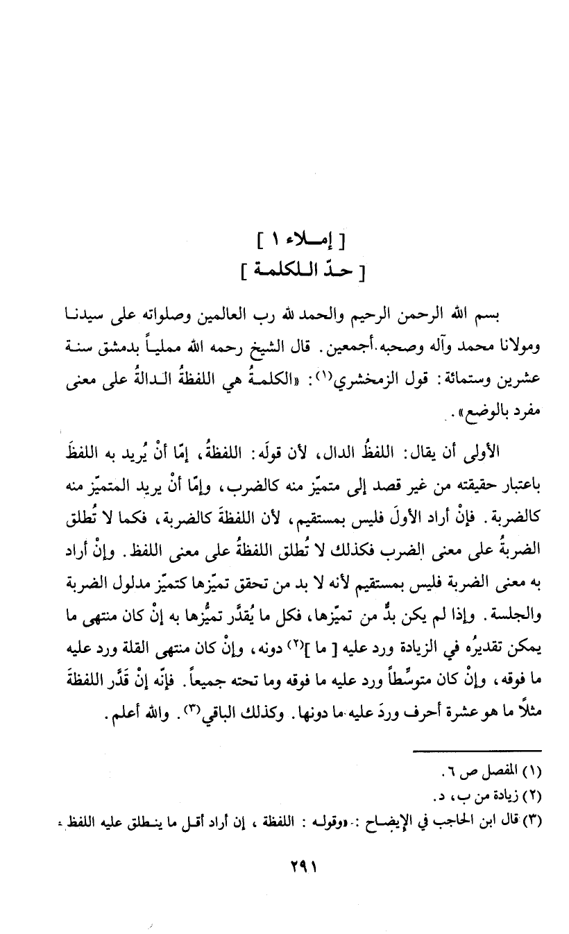 بسم الله الرحمن الرحيم والحمد لله رب العالمين وصلواته على سيدنا ومولانا محمد وآله وصحبه أجمعين. قال الشيخ رحمه الله مملياً بدمشق سنة عشرين وستمائة: قول الزمخشري (¬1): "الكلمة هي اللفظة الدالة على معنى مفرد بالوضع".