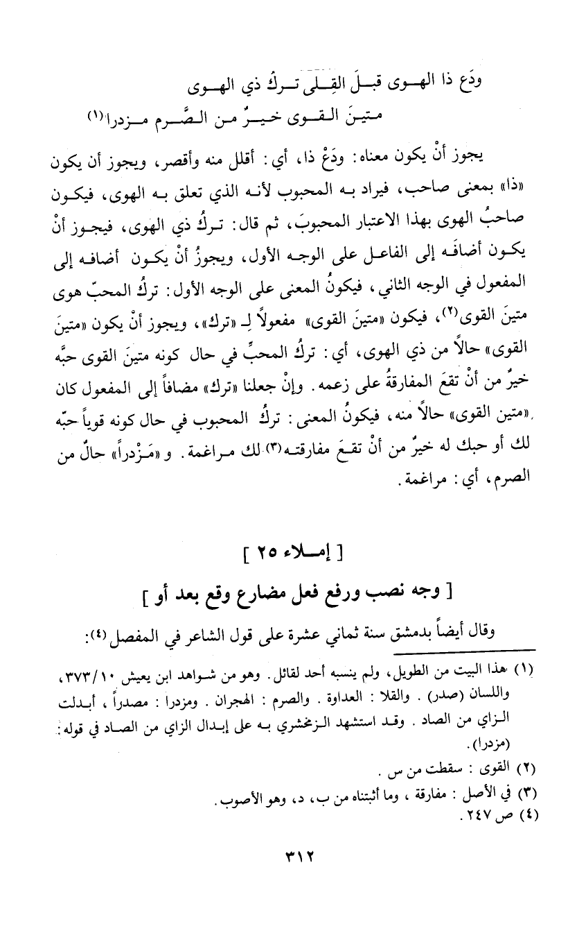 يجوز أن يكون معناه: ودع ذا، أي: أقلل منه وأقصر، ويجوز أن يكون "ذا" بمعنى صاحب، فيراد به المحبوب لأنه لذي تعلق به الهوى، فيكون صاحب الهوى بهذا الاعتبار المحبوب، ثم قال: ترك ذي الهوى، فيجوز أن يكون أضافه إلى الفاعل على الوجه الأول، ويجوز أن يكون أضافه إلى المفعول في الوجه الثاني: فيكون المعنى على الوجه الأول: ترك المحب هوى متين القوى (¬2)، فيكون "متين القوى" مفعولاً لـ (ترك"، ويجوز أن يكون "متين القوى" حالاً من ذي الهوى، أي: ترك المحب في حال كونه متين القوى حبه خير من أن تقع المفارقة على زعمه. وإن جعلنا "ترك" مضافاً إلى المفعول كان "متين القوى" حالاً منه، فيكون المعنى: ترك المحبوب في حال كونه قوياً حبه لك أو حبك له خير من أن تقع مفارقته (¬3) لك مراغمة. و"مزدراً" حال من الصرم، أي: مراغمة.