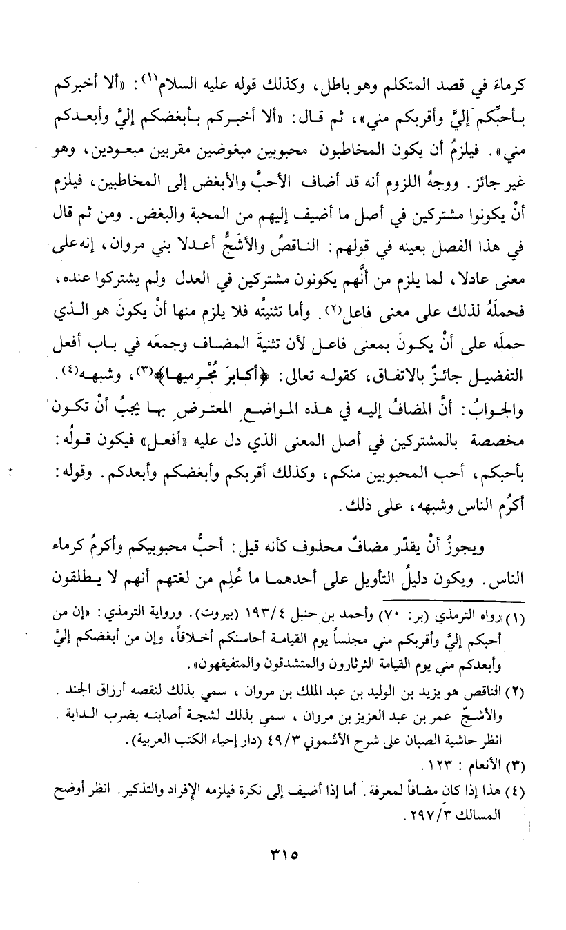 كرماء في قصد المتكلم وهو باطل، وكذلك قوله عليه السلام (¬1): "ألا أخبركم بأحبكم إلي وأقربكم مني"، ثم قال: "ألا أخبركم بأبغضكم إلي وأبعدكم مني". فيلزم أن يكون المخاطبون محبوبين مبغوضين مقربين مبعودين، وهو غير جائز. ووجه اللزوم أنه قد أضاف الأحب والأبغض إلى المخاطبين، فيلزم أن يكونوا مشتركين في أصل ما أضيف إليهم من المحبة والبغض. ومن ثم قال في هذا الفصل بعينه في قولهم: الناقص والأشج أعدلا بني مروان، إنه على معنى عادلا، لما يلزم من أنهم يكونون مشتركين في العدل ولم يشتركوا عنده، فحمله لذلك على معنى فاعل (¬2). وأما تثنيته فلا يلزم منها أن يكون هو الذي حمله على أن يكون بمعنى فاعل لأن تثنية المضاف وجمعه في باب أفعل التفضيل جائز بالاتفاق، كقوله تعالى: {أكابر مجرميها} (¬3)، وشبهه (¬4). والجواب: أن المضاف إليه في هذه المواضع المعترض بها يجب أن تكون مخصصة بالمشتركين في أصل المعنى الذي دل عليه "افعل" فيكون قوله: بأحبكم، أحب المحبوبين منكم، وكذلك أقربكم وأبغضكم وأبعدكم. وقوله: أكرم الناس وشبهه، على ذلك.