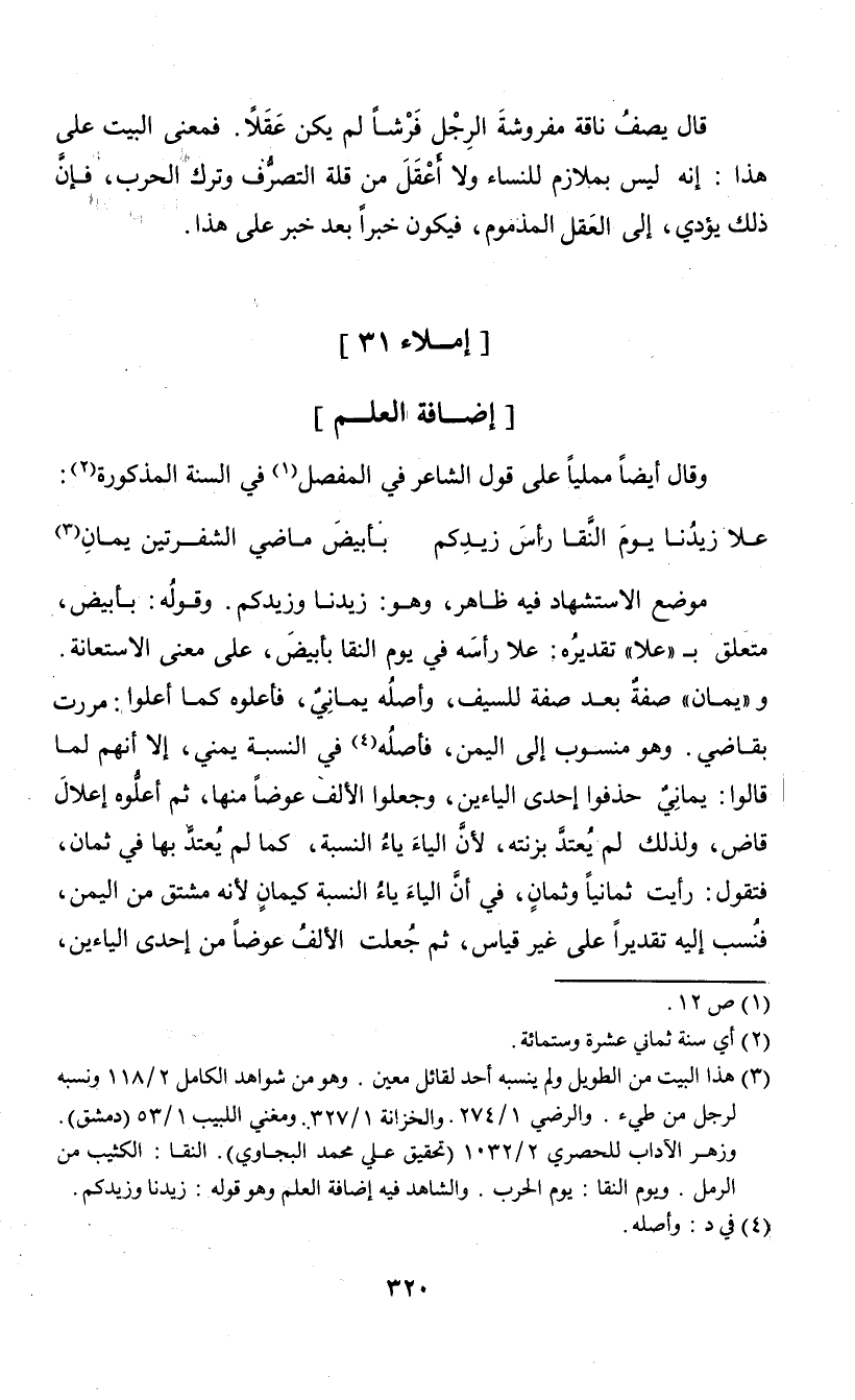 موضع الاستشهاد فيه ظاهر، وهو: زيدنا وزيدكم. وقوله: أبيض، متعلق بـ "علا" تقديره: علا رأسه في يوم النقا بأبيض، على معنى الاستعانة. و"يمان" صفة بعد صفة للسيف، وأصله يماني، فأعلوه كما أعلوا: مررت بقاضي. وهو منسوب إلى اليمن، فأصله (¬4) في النسبة يمني، إلا أنهم لما قالوا: يماني حذفوا إحدى الياءين، وجعلوا الألف عوضا منها، ثم أعلوه إعلال قاض، ولذلك لم يعتد بزنته، لأن الياء ياء النسبة، كما لم يعتد بها في ثمان، فتقول: رأيت ثمانياً وثمان، في أن الياء ياء النسبة كيمان لأنه مشتق من اليمن، فنسب إليه تقديراً على غير قياس، ثم جعلت الألف عوضاً من إحدى الياءين،