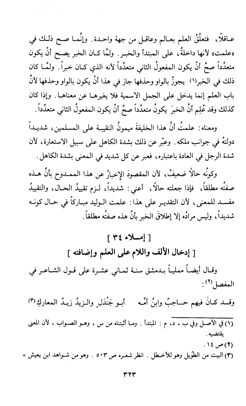 (¬3) البيت من الطويل وهو للأخطل. انظر شعره ص 503. وهو من شواهد ابن يعيش 1/ 44. والزيد هو زيد بن عبد الله بن دارم، أو زيد بن نهشل، وأبو جندل هو نهشل. وحاجب اسم شخص. وموضع استشهاده إدخال الألف واللام على زيد، وهو علم، وإضافته.