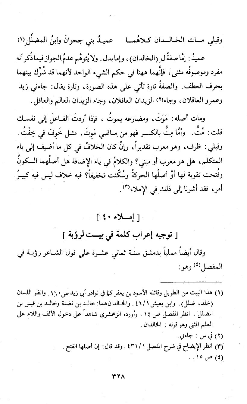 عميد: إما صفة لـ (الخالدان9، وإما بدل. ولا يثوهم عدم الجواز فيما ذكر أنه مفرد وموصوفه مثني، فإنهما ههنا في حكم الشيء الواحد لأنهما قد شرك بينهما بحرف العطف. والصفة تارة تأتي على هذه الصورة، وتارة يقال: جاءني زيد وعمرو العاقلان، وجاء (¬2) الزيدان العاقلان، وجاء الزيدان العالم والعاقل.