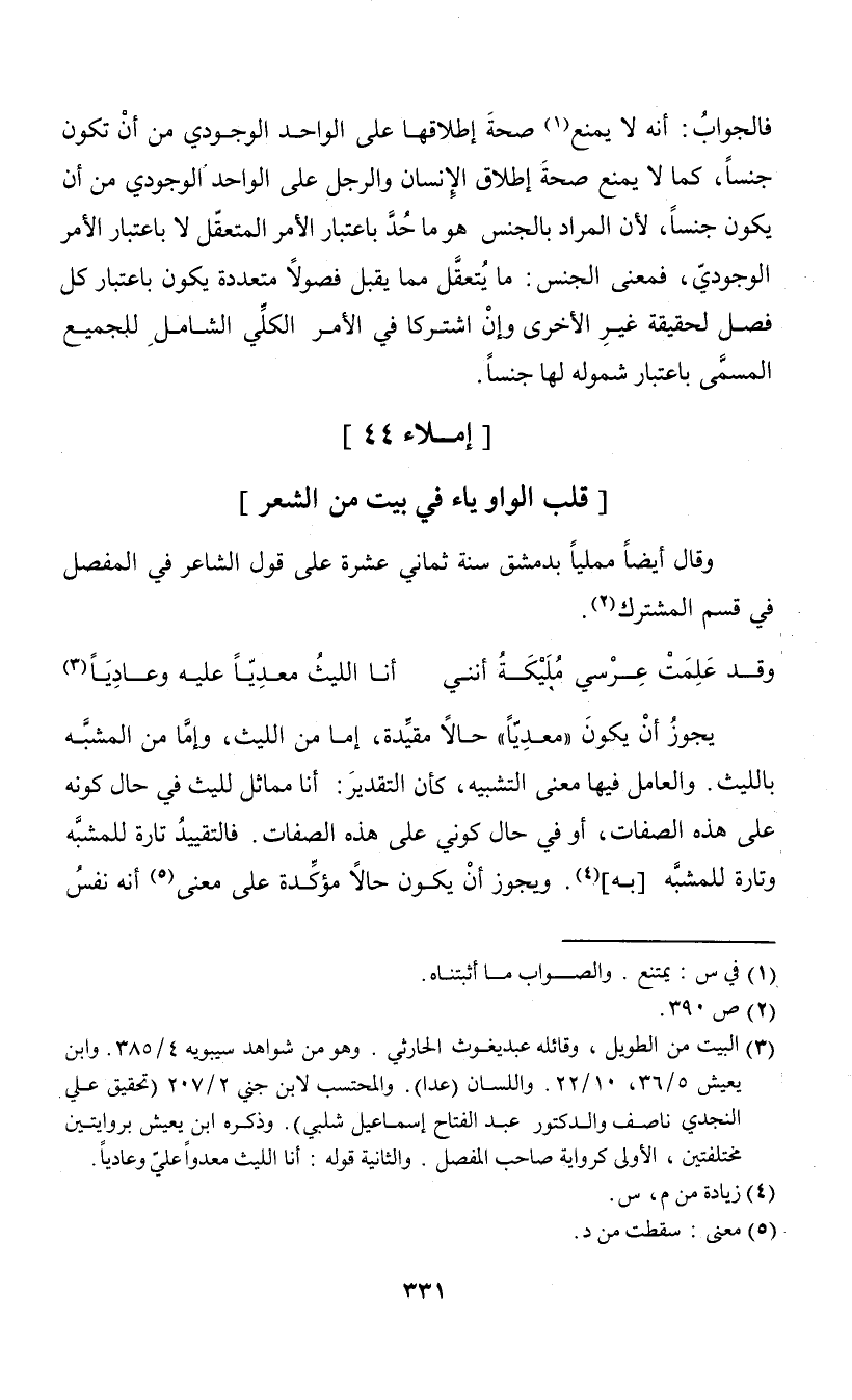 يجوز أن يكون "معديا" حالاً مقيدة، إما من الليث، وإما من المشبه بالليث. والعامل فيها معنى التشبيه، كأن التقدير: أنا مماثل لليث في حال كونه على هذه الصفات، أو في حال كوني على هذه الصفات. فالتقييد تارة للمشبه وتارة للمشبه [به] (¬4). ويجوز أن يكون حالاً مؤكدة على معنى (¬5) أنه نفس