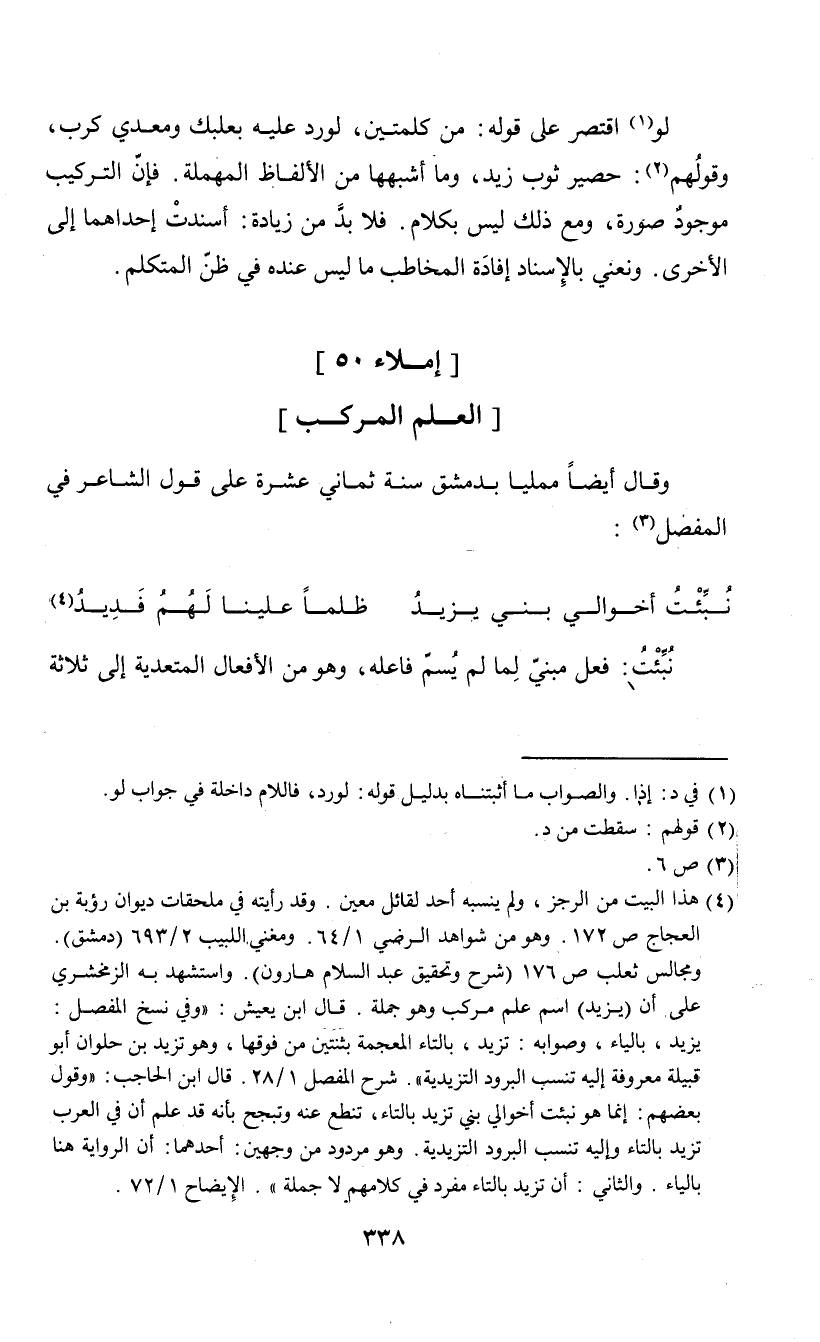 (¬4) هذا البيت من الرجز، ولم ينسبه أحد لقائل معين. وقد رأيته في ملحقات ديوان رؤية بن العجاج ص 172. وهو من شواهد الرضى 1/ 64. ومغني اللبيب 2/ 693 (دمشق). ومجالس ثعلب ص 176 (شرح وتحقيق عبد السلام هارون). واستشهد به الزمخشري على أن (يزيد) اسم علم مركب وهو جملة. قال ابن يعيش: "وفي نسخ المفصل: يزيد، بالياء، وصوابه: تزيد، بالتاء المعجمة بثنتين من فوقها، وهو تزيد بن حلوان أبو قبيلة معروفة إليه تنسب البرود التزيدية". شرح المفصل 1/ 28. قال ابن الحاجب: "وقول بعضهم: إنما هو نبئت أخوالي بني تزيد بالتاء، تنطع عنه وتبجح بأنه قد علم أن في العرب تزيد بالتاء وإليه تنسب البرود التزيدية. وهو مردود من وجهين: أحدهما: أن الرواية هنا بالياء. والثاني: أن تزيد بالتاء مفرد في كلامهم لا جملة". الإيضاح 1/ 72.