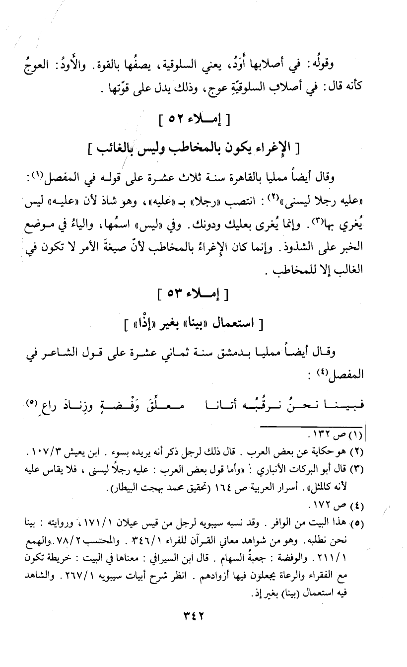 وقال أيضاً ممليا بالقاهرة سنة ثلاث عشرة على قوله في المفصل (¬1): "عليه رجلا ليسني" (¬2): انتصب "رجلا" بـ "عليه"، وهو شاذ لأن "عليه" ليس يغري بها (¬3). وإنما يغري بعليك ودونك. وفي "ليس" اسمها، والياء في موضع الخبر على الشذوذ. وإنما كان الإغراء بالمخاطب لأن صيغة الأمر لا تكون في الغالب إلا للمخاطب.