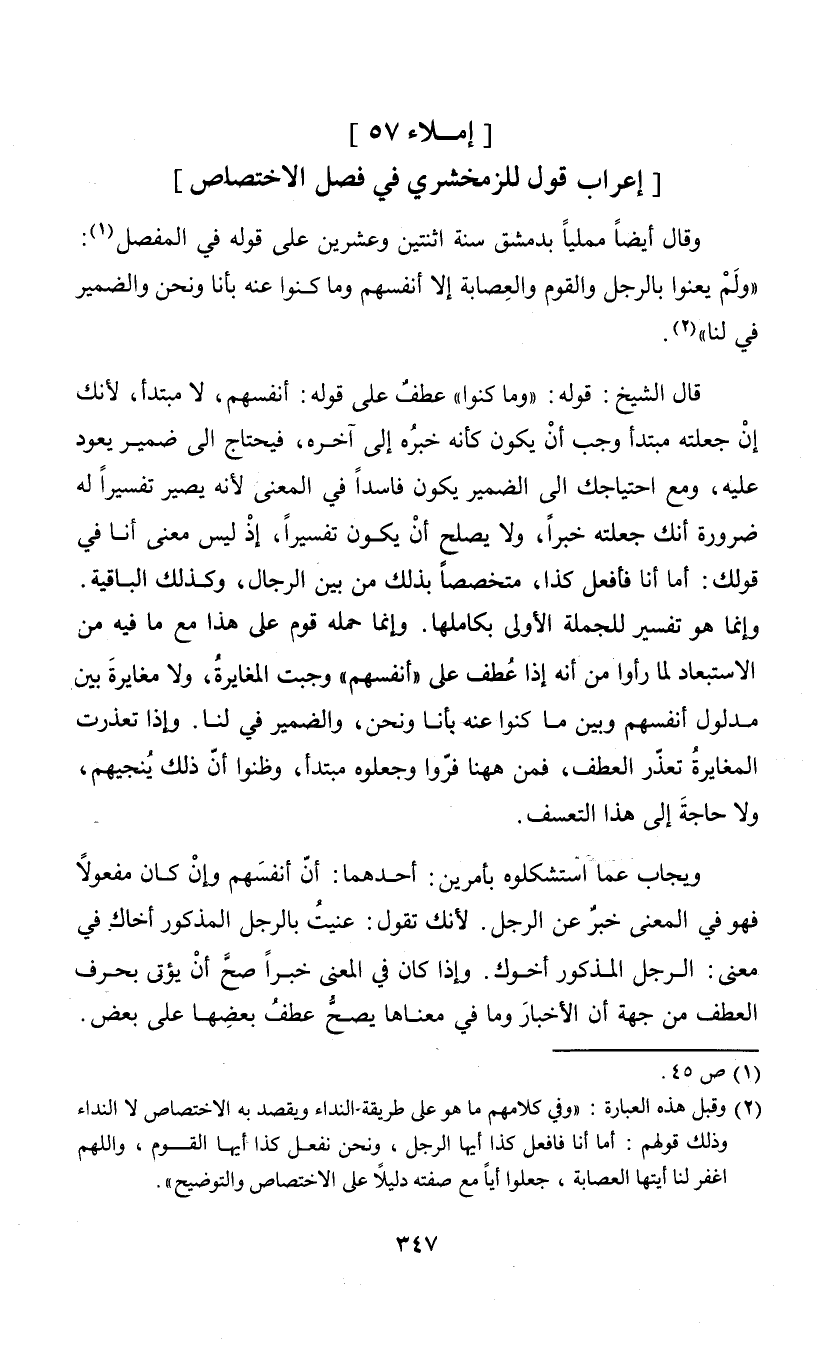 (¬2) وقبل هذه العبارة: "وفي كلامهم ما هو على طريقة النداء ويقصد به الاختصاص لا النداء وذلك قولهم: أما أنا فافعل كذا أيها الرجل، ونحن نفعل كذا أيها القوم، والمهم اغفر لنا أيتها العصابة، جعلوا أيا مع صفته دليلاً على الاختصاص والتوضيح".