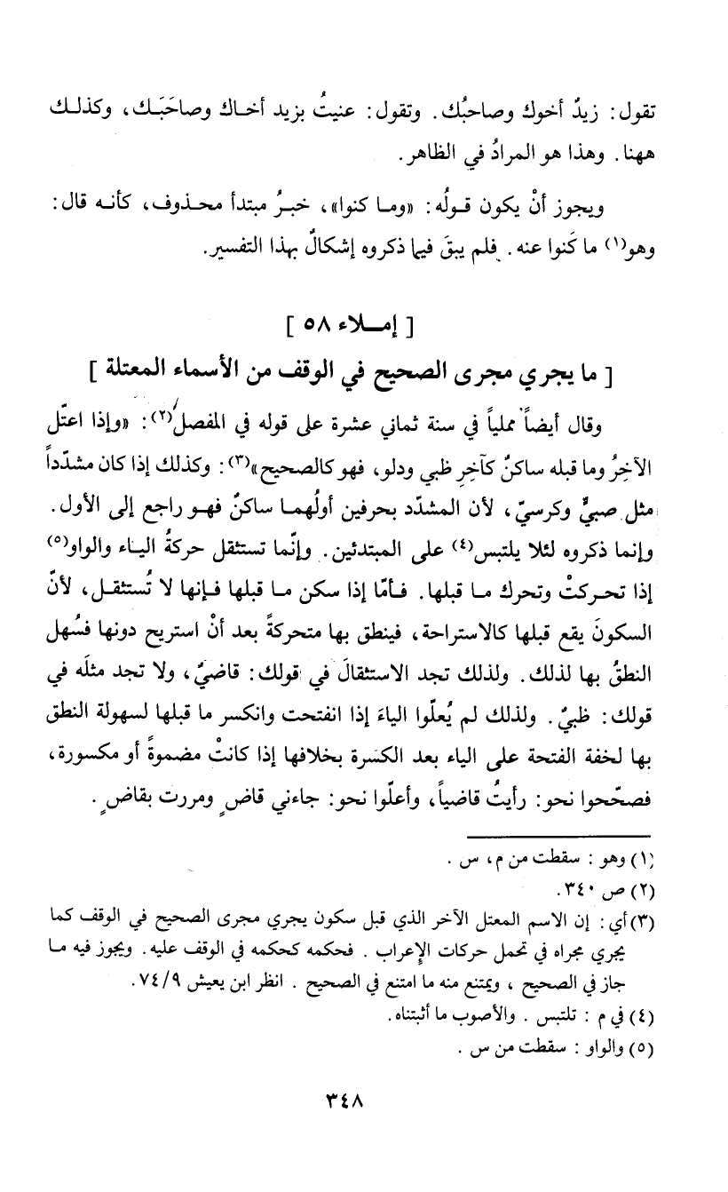 (¬3) أي: إن الاسم المعتل الآخر الذي قبل سكون يجري مجرى الصحيح في الوقف كما يجري مجراه في تحمل حركات الإعراب. فحكمه كحكمة في الوقف عليه. ويجوز فيه ما جاز في الصحيح، ويمتنع منه ما امتنع في الصحيح. انظر ابن يعيش 9/ 74.