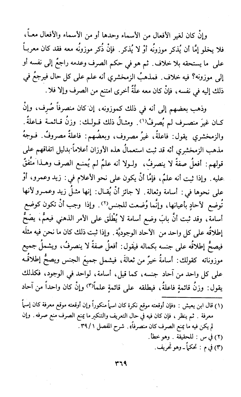 وإن كان لغير الأفعال من الأسماء وحدها أو من الأسماء والأفعال معاً، فلا يخلو إما أن يذكر موزونة أو لا يذكر. فإن ذكر موزونة معه فقد كان معرباً على ما يستحقه بلا خلاف. ثم هو في حكم الصرف وعدمه راجع إلى نفسه أو إلى موازنه؟ فيه خلاف. فمذهب الزمخشري أنه علم على كل حال فيرجع في ذلك إليه في نفسه، فإن كان معه علة أخرى امتنع من الصرف وإلا فلا.