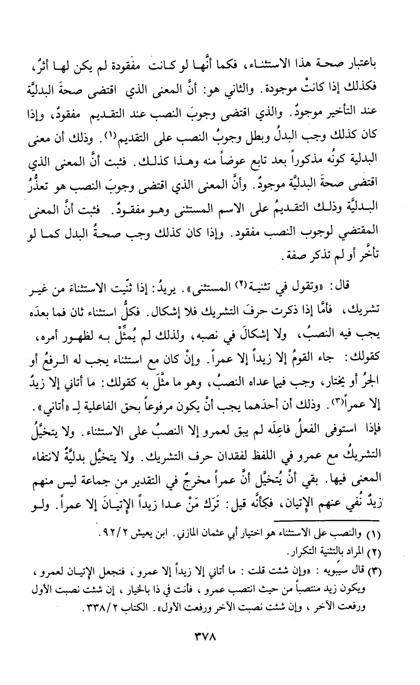 باعتبار صحة هذا الاستثناء، فكما أنها لو كانت مفقودة لم يكن لها أثر، فكذلك إذا كانت موجودة. والثاني هو: أن المعنى الذي اقتضى صحة البدلية عند التأخير موجود. والذي اقتضى وجوب النصب عند التقديم مفقود، وإذا كان كذلك وجب البدل وبطل وجوب النصب على التقديم (¬1). وذلك أن معنى البدلية كونه مذكوراً بعد تابع عوضاً منه وهذا كذلك. فثبت أن المعنى الذي اقتضى صحة البدلية موجود. وأن المعنى الذي اقتضى وجوب النصب هو تعذر البدلية وذلك التقديم على الاسم المستثنى وهو مفقود. فثبت أن المعنى المقتضى لوجوب النصب مفقود. وإذا كان كذلك وجب صحة البدل كما لو تأخر أو لم تذكر صفة.