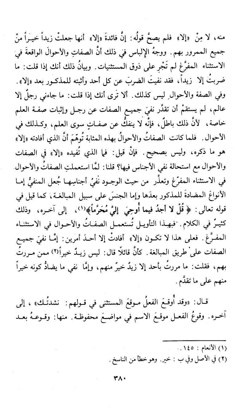 منه، لا من "إلا" فلم يصح قوله: إن فائدة "إلا" أنها جعلت زيداً خيراً من جميع الممرور بهم. ووجه الإلباس في ذلك أن الصفات والأحوال الواقعة في الاستثناء المفرغ لم تجر على ذوق المستثنيات. وبيان ذلك أنك إذا قلت: ما ضربت إلا زيداً، فقد نفيت الضرب عن كل أحد وأثبته للمذكور بعد "إلا". وفي الصفة والأحوال ليس كذلك. ألا ترى أنك إذا قلت: ما جاءني رجل إلا عالم، لم يستقم أن تقدر نفي جميع الصفات عن رجل وإثبات صفة العلم خاصة، لأن ذلك باطل، فإنه لا ينفك عن صفات سوى العلم، وكذلك في الأحوال. فلما كانت الصفات والأحوال بهذه المثابة توهم أن الذي أفادته "إلا" هو ما ذكره، وليس بصحيح. فإن قيل: فما الذي تفيده "إلا" في الصفات والأحوال مع استحالة نفي الأجناس فيها؟ قلنا: لما استعملت الصفات والأحوال في الاستثناء المفرغ وتعذر من حيث الوجود نفي أجناسها جعل المنفي إما الأنواع المضادة للمذكور بعدها وإما الجنس على سبيل المبالغة، كما قيل في قوله تعالى: {قل لا أجد فيما أوحى إلى محرما} (¬1)، إلى آخره، وذلك كثير في الكلام. فبهذا التأويل تستعمل الصفات والأحوال في الاستثناء المفرغ. فعلى هذا لا تكون "إلا" أفادت إلا أحد أمرين: إما نفي جميع الصفات على طريق المبالغة. كأن قائلاً قال: ليس زيد خيراً (¬2) ممن مررت بهم، فقلت: ما مررت بأحد إلا زيد خير منهم، وإما نفي ما يضاد كونه خيراً منهم على ما تقدم.