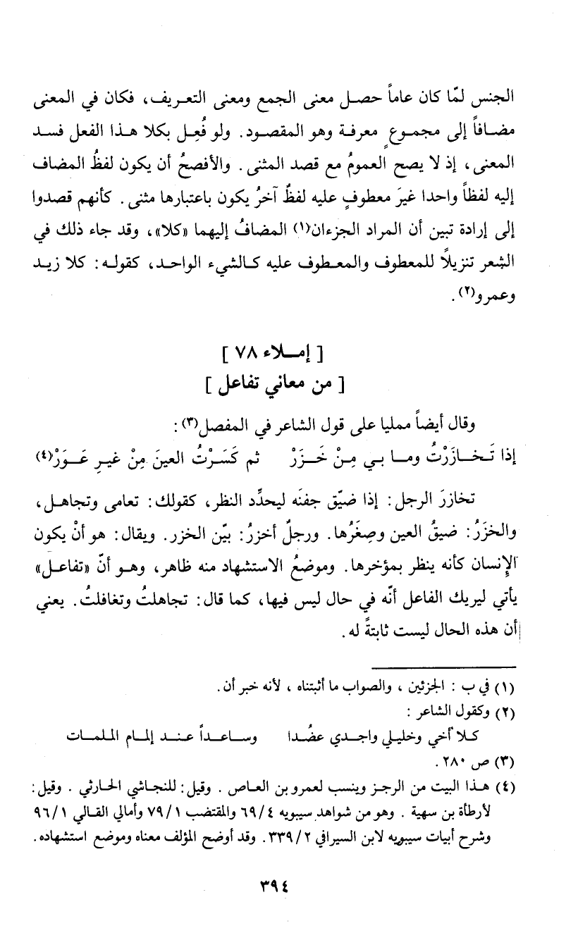 الجنس لما كان عاماً حصل معنى الجمع ومعنى التعريف، فكان في المعنى مضافاً إلى مجموع معرفة وهو المقصود. ولو فعل بكلا هذا الفعل فسد المعنى، إذ لا يصح العموم مع قصد المثنى. والأفصح أن يكون لفظ المضاف إليه لفظاً واحداً غير معطوف عليه لفظ آخر يكون باعتبارها مثنى. كأنهم قصدوا إلى إرادة تبين أن المراد الجزاءان (¬1) المضاف إليهما "كلا"، وقد جاء ذلك في الشعر تنزيلا للمعطوف والمعطوف عليه كالشيء الواحد، كقوله: كلا زيد وعمرو (¬2).