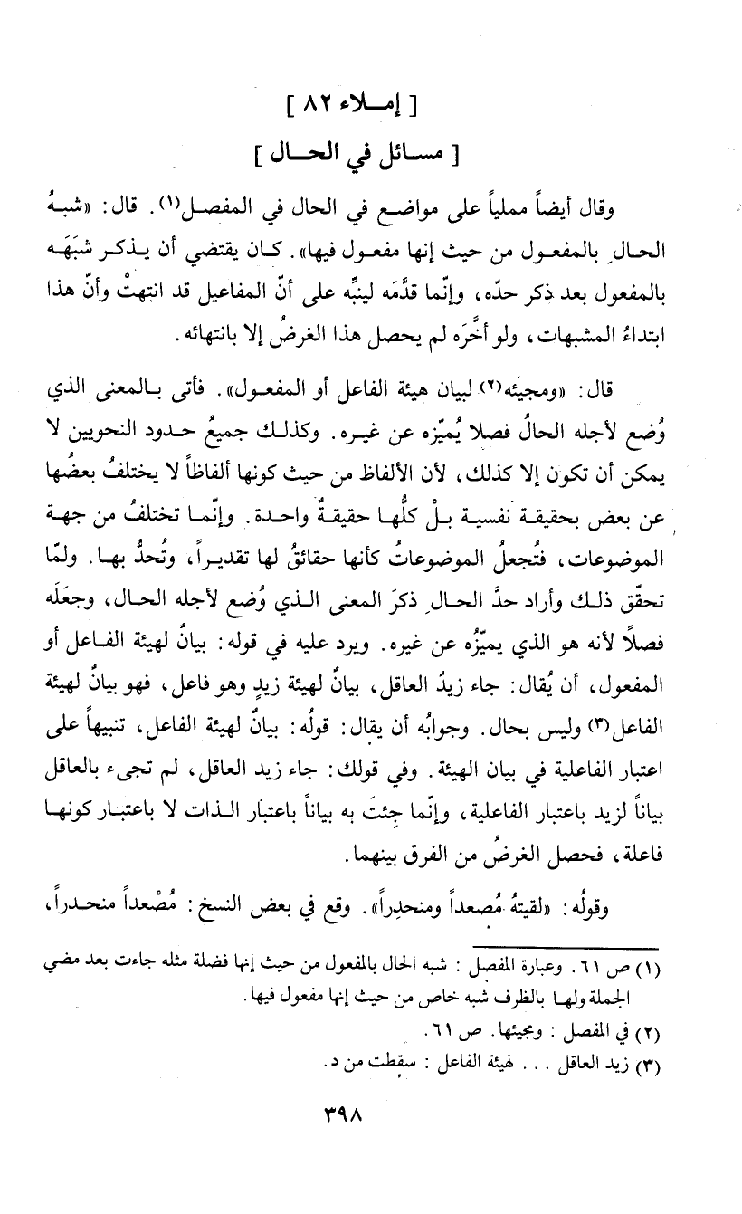 (¬1) ص 61. وعبارة المفصل: شبه الحال بالمفعول من حيث إنها فضلة مثله جاءت بعد مضي الجملة ولها بالظرف شبه خاص من حيث إنها مفعول فيها.