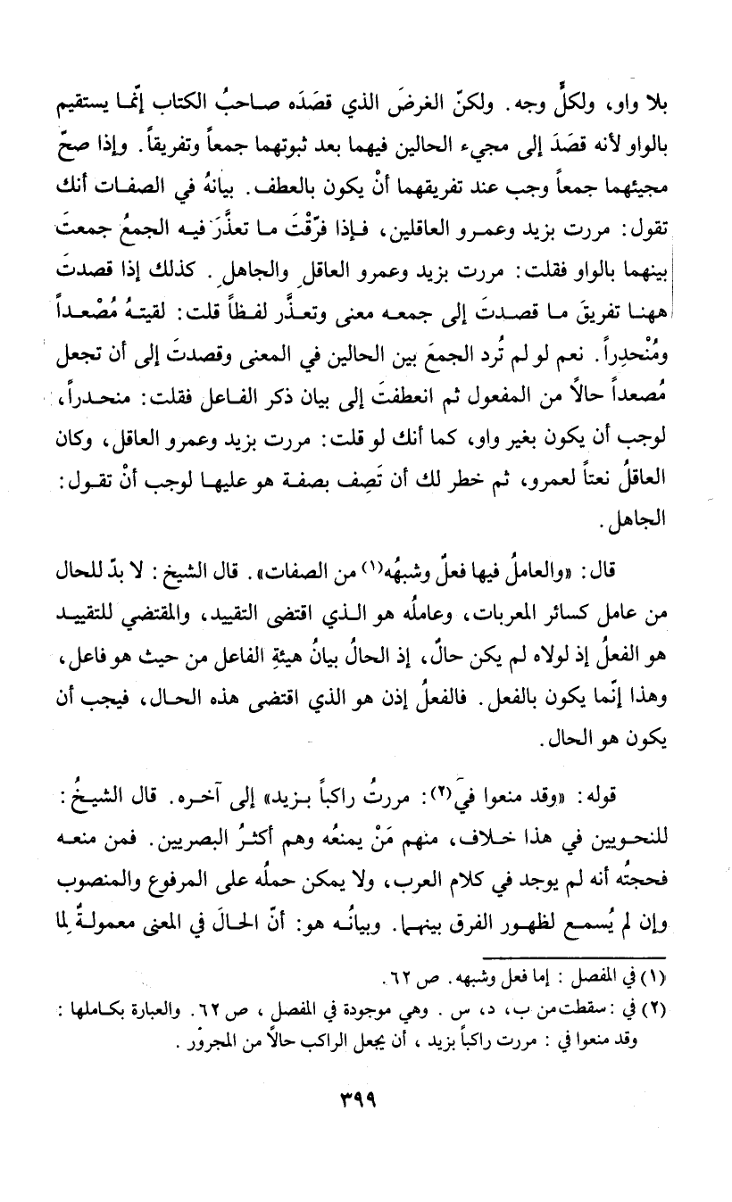 (¬2) في: سقطت من ب، د، س. وهي موجودة في المفصل، ص 62. والعبارة بكاملها: وقد منعوا في: مررت راكباً بزيد، أن يجعل الراكب حالاً من المجرور.