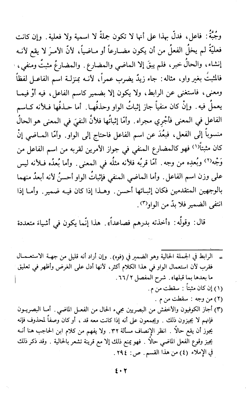 (¬3) أجاز الكوفيون والأفخش من البصريين مجيء الحال من الفعل الماضي. أما البصريون فإنهم لا يجيزون ذلك. ويجمعون على أنه إذا كانت معه قد، أو كان وصفاً لمحذوف فإنه يجوز أن يقع حالاً. انظر الإنصاف مسألة 32. ولا يفهم من كلام ابن الحاجب هنا أنه يجيز وقوع الفعل الماضي حالاً. فهو يمنع ذلك إلا مع قرينة تشعر بالحالية. وقد ذكر ذلك في الإملاء (4) من هذا القسم. ص: 294.