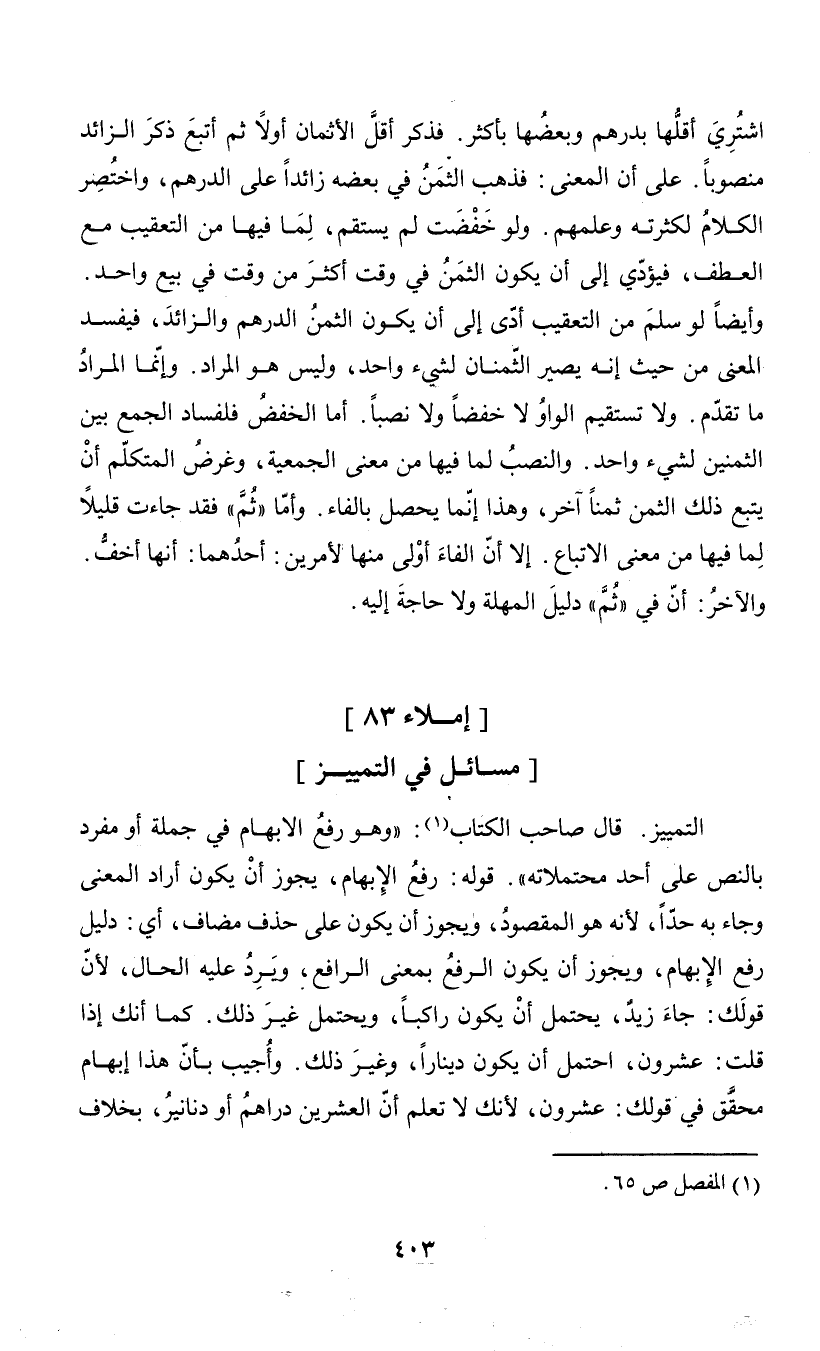 اشترى أقلها بدرهم وبعضها بأكثر. فذكر أقل الأثمان أولاً ثم أتبع ذكر الزائد منصوباً. على أن المعنى: فذهب الثمن في بعضه زائداً على الدرهم، واختصر الكلام لكثرته وعلمهم. ولو خفضت لم يستققم، لما فيها من التعقيب مع العطف، فيؤدي إلى أن يكون الثمن في وقت أكثر من وقت في بيع واحد. وأيضاً لو سلم من التعقيب أدى إلى أن يكون الثمن الدرهم والزائد، فيفسد المعنى من حيث إنه يصير الثمنان لشيء واحد، وليس هو المراد. وإنما المراد ما تقدم. ولا تستقديم الواو لا خفضاً ولا نصباً. أما الخفض فلفساد الجمع بين الثمنين لشيء واحد. والنصب لما فيها من معنى الجمعية، وغرض المتكلم أن يتبع ذلك الثمن ثمناً آخر، وهذا إنما يحصل بالفاء. وأما "ثم" فقد جاءت قليلاً لما فيها من معنى الاتباع. إلا أن الفاء أولى منها لأمرين: أحدهما: أنها أخف. والآخر: أن في "ثم" دليل المهلة ولا حاجة إليه.