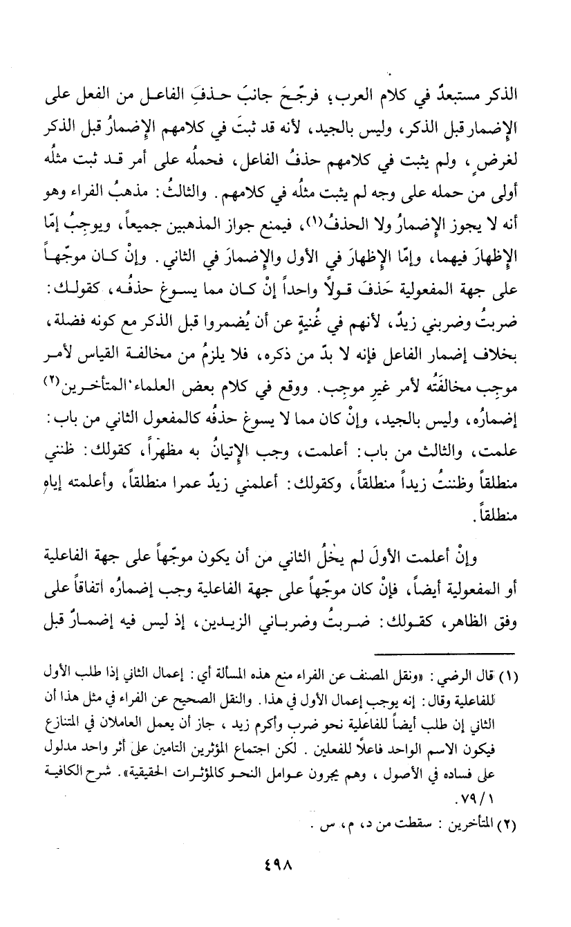 الذكر مستبعد في كلام العرب؛ فرجح جانب حذف الفاعل من الفعل على الإضمار قبل الذكر، وليس بالجيد، لأنه قد ثبت في كلامهم الإضمار قبل الذكر لغرض، ولم يثبت في كلامهم حذف الفاعل، فحمله على أمر قد ثبت مثله أولى من حمله على وجه لم يثبت مثله في كلامهم. والثالث: مذهب الفراء وهو أنه لا يجوز الإضمار ولا الحذف (¬1)، فيمنع جواز المذهبين جميعاً، ويوجب إما الإظهار فيهما، وإما الإظهار في الأول والإضمار في الثاني. وإن كان موجهاً على جهة المفعولية حذف قولاً واحداً إن كان مما يسوغ حذفه، كقولك: ضربت وضربني زيد، لأنهم في غنية عن أن يضمروا قبل الذكر مع كونه فضلة، بخلاف إضمار الفاعل فإنه لابد من ذكره، فلا يلزم من مخالفة القياس لأمر موجب مخالفته لأمر غير موجب. ووقع في كلام بعض العلماء المتأخرين (¬2) إضماره، وليس بالجيد، وإن كان مما لا يسوغ حذفه كالمفعول الثاني من باب: علمت، والثالث من باب: أعلمت، وجب الإتيان به مظهراً، كقولك: ظنني منطلقاً وظننت زيداً منطلقاً، وكقولك: أعلمني زيد عمرا منطلقاً، وأعلمته إياه منطلقاً.