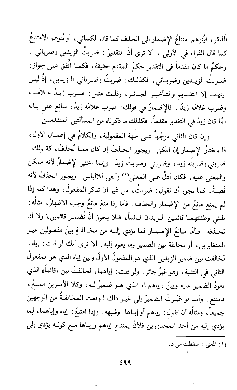 الذكر، فيتوهم امتناع الإضمار إلى الحذف كما قال الكسائي، أو يتوهم الامتناع كما قال الفراء في الأولى، ألا ترى أن التقدير: ضربت الزيدين وضرباني. وحكم ما كان مقدماً في التقدير حكم المقدم حقيقة، فكما اتفق على جواز: ضربت الزيدين وضرباني، فكذلك: ضربت وضرباني الزيدين، إذ ليس بينهما إلا التقديم والتأخير الجائز، وذلك مثل: ضرب زيد غلامه، وضرب غلامه زيد. فالإضمار في قولك: ضرب غلامه زيد، سائغ على بابه لما كان زيد في التقدير مقدماً، فكذلك ما ذكرناه من المسألتين المتقدمتين.