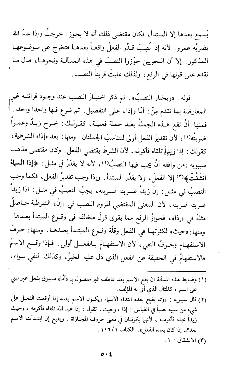 (¬2) قال سيبويه: "ومما يقبح بعده ابتداء الأسماء ويكون الاسم بعده إذا أوقعت الفعل على شيء من سببه نصباً في القياس: إذا، وحيث، تقول: إذا عبد الله تلقاه فأكرمه، وحيث زيداً تجده فأكرمه، لأنهما يكونان في معنى حروف المجازاة. ويقبح إن ابتدأت الاسم بعدهما إذا كان بعده الفعل". الكتاب 1/ 106.