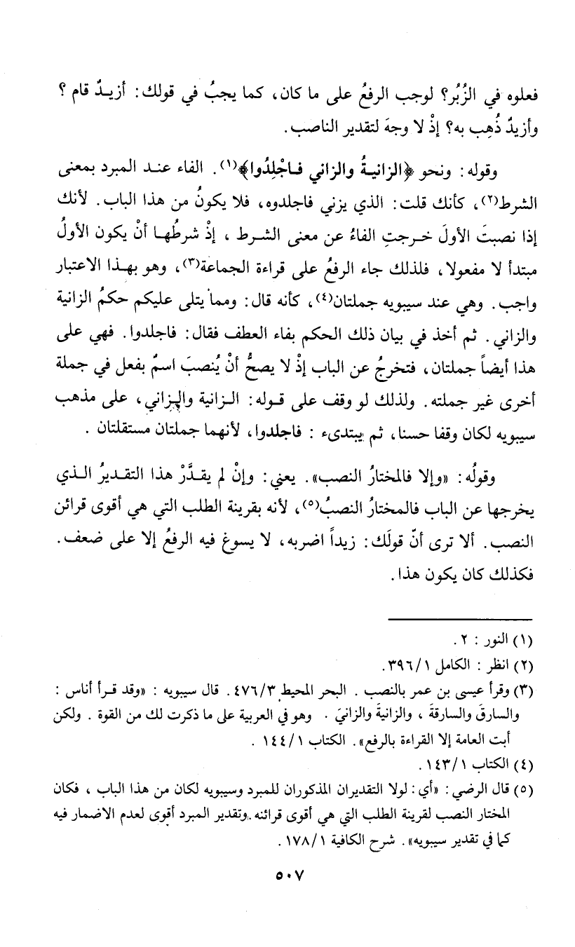 (¬5) قال الرضي: "أي: لولا التقديران المذكوران للمبرد وسيبويه لكان من هذا الباب، فكان المختار النصب لقرينة الطلب التي هي أقوى قرائنه وتقدير المبرد أقوى لعدم الإضمار فيه كما في تقدير سيبويه". شرح الكافية 1/ 178.