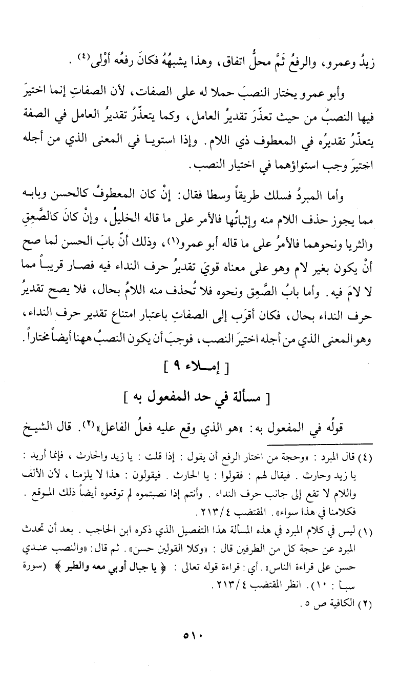 (¬2) ليس في كلام المبرد في هذه المسألة هذا التفصيل الذي ذكره ابن الحاجب. بعد أن تحدث المبرد عن حجة كل من الطرفين قال: "وكلا القولين حسن". ثم قال: "والنصب عندي حسن على قراءة الناس". أي: قراءة قوله تعالى: "يا جبال أوبي معه والطير" (سورة سبأ: 10). انظر المقتضب 4/ 213.