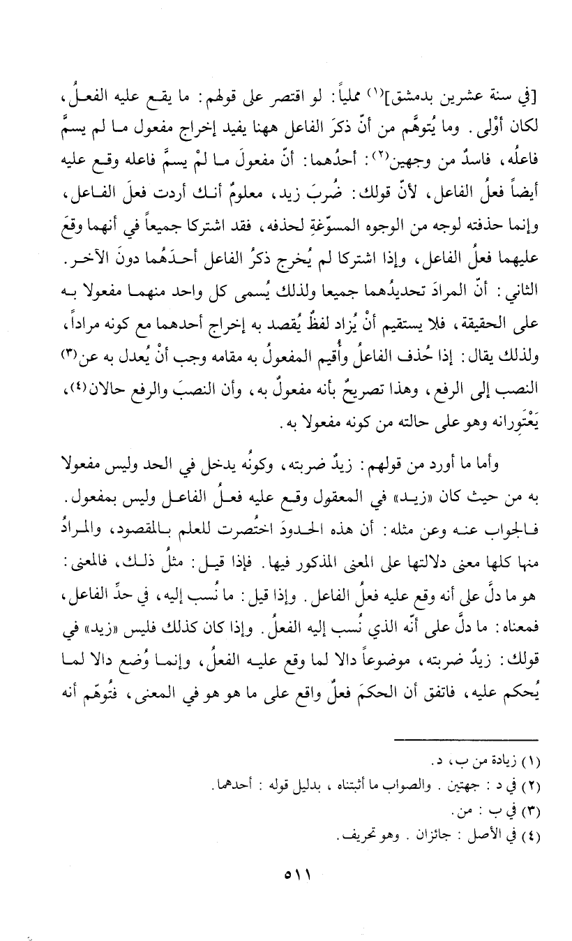 [في سنة عشرين بدمشق] (¬1) مملياً: لو اقتصر على قولهم: ما يقع عليه الفعل، لكان أولى. وما يتوهم من أن ذكر الفاعل ههنا يفيد إخراج مفعول ما لم يسم فاعله، فاسد من وجهين (¬2): أحدهما: أن مفعول ما لم يسم فاعله وقع عليه أيضاً فعل الفاعل، لأن قولك: ضرب زيد، معلوم أنك أردت فعل الفاعل، وإنما حذفته لوجه من الوجوه المسوغة لحذفه، فقد اشتركا جميعاً في أنهما وقع عليهما فعل الفاعل، وإذا اشتركا لم يخرج ذكر الفاعل أحدهما دون الآخر. الثاني: أن المراد تحديدهما جميعا ولذلك يسمى كل واحد منهما مفعولا به على الحقيقة، فلا يستقيم أن يزاد لفظ يقصد به إخراج أحدهما مع كونه مراداً، ولذلك يقال: إذا حذف الفاعل وأقيم المفعول به مقامه وجب أن يعدل به عن (¬3) النصب إلى الرفع، وهذا تصريح بأنه مفعول به، وأن النصب والرفع حالان (¬4)، يعتورانه وهو على حالته من كونه مفعولا به.