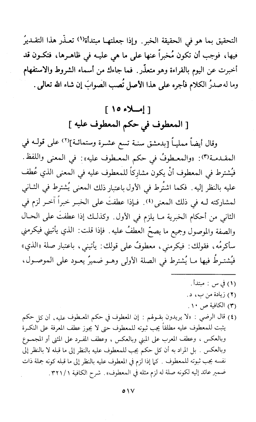 (¬4) قال الرضي: "لا يريدون بقولهم: إن المعطوف في حكم المعطوف عليه، أن كل حكم يثبت للمعطوف عليه مطلقاً يجب ثبوته للمعطوف حتى لا يجوز عطف المعرفة على النكرة وبالعكس، وعطف المعرب على المبني وبالعكس، وعطف المفرد على المثنى أو المجموع وبالعكس. بل المراد به أن كل حكم يجب للمعطوف عليه بالنظر إلى ما قبله لا بالنظر إلى نفسه يجب ثبوته للمعطوف. كما إذا لزم في المعطوف عليه بالنظر إلى ما قبله كونه جملة ذات ضمير عائد إليه لكونه صلة له لزم مثله في المعطوف". شرح الكافية 1/ 321.