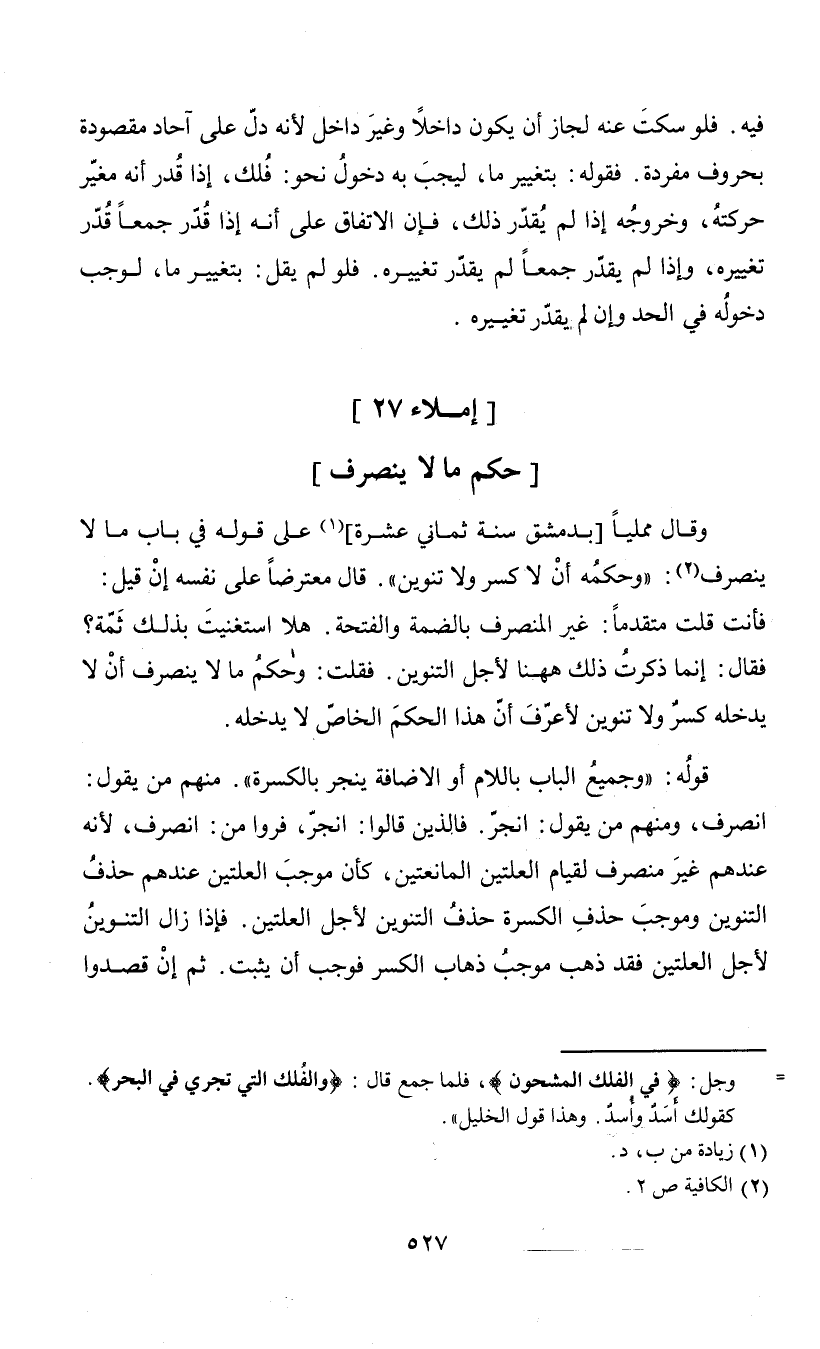 وقال مملياً [بدمشق سنة ثماني عشرة] (¬1) على قوله في باب ما لا ينصرف (¬2): "وحكمه أن لا كسر ولا تنوين". قال معترضاً على نفسه إن قيل: فأنت قلت متقدماً: غير المنصرف بالضمة والفتحة. هلا استغنيت بذلك ثمة؟ فقال: إنما ذكرت ذلك ههنا لأجل التنوين. فقلت: وحكم ما لا ينصرف أن لا يدخله كسر ولا تنوين لأعرف أن هذا الحكم الخاص لا يدخله.