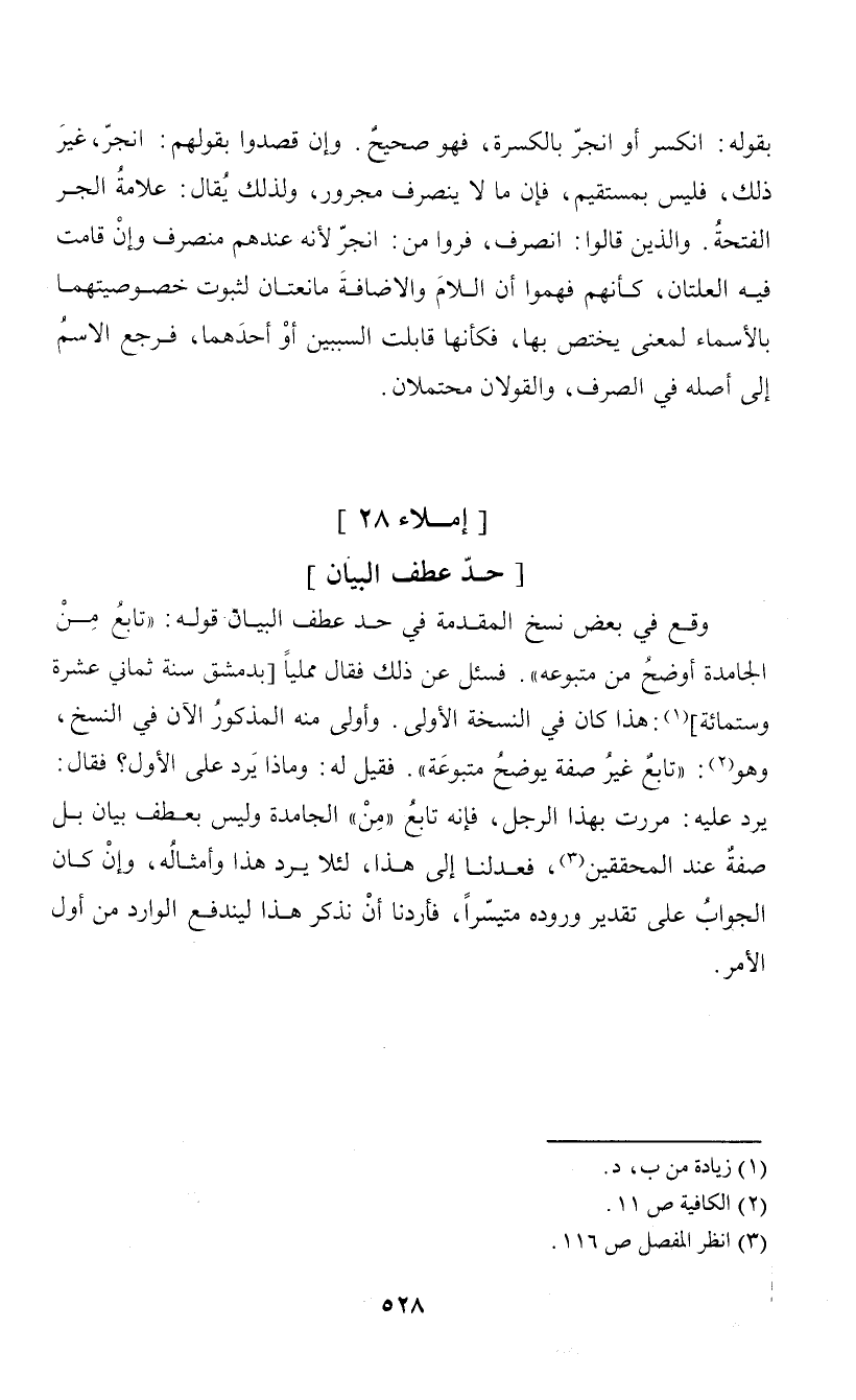 وقع في بعض نسخ المقدمة في حد عطف البيان قوله: "تابع من الحامدة أوضح من متبوعه". فسئل عن ذلك فقال مملياً [بدمشق سنة ثماني عشرة وستمائة] (¬1): هذا كان في النسخة الأولى. وأولى منه المذكور الآن في النسخ، وهو (¬2): "تابع غير صفة يوضع متبوعة". فقيل له: وماذا يرد على الأول؟ فقال: يرد عليه: مررت بهذا الرجل، فإنه تابع "من" الجامدة وليس بعطف بيان بل صفة عند المحققين (¬3)، فعدلنا إلى هذان لئلا يرد هذا وأمثاله، وإن كان الجواب على تقدير وروده متيسراً، فأردنا أن تذكر هذا ليندفع الوارد من أول الأمر.