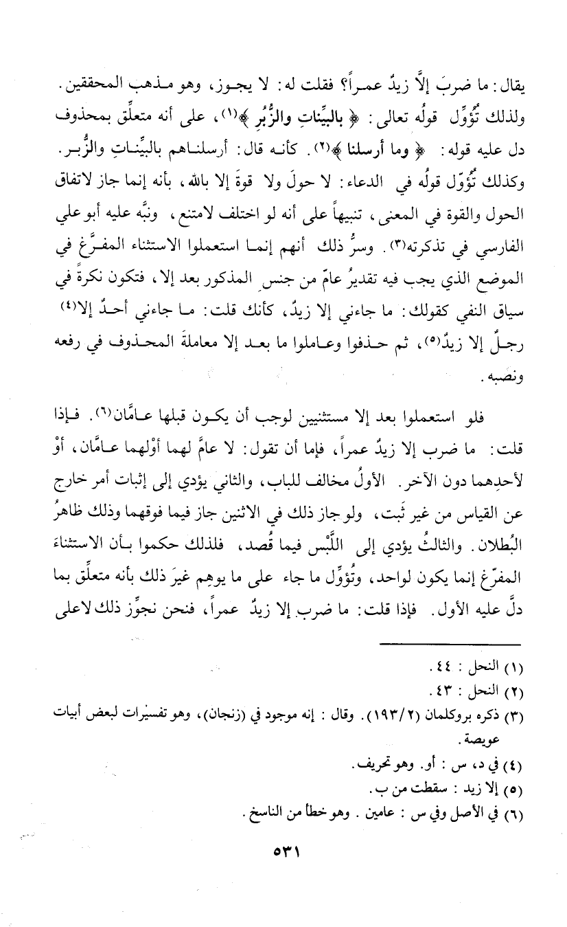 فلو استعملوا بعد إلا مستثنيين لوجب أن يكون قبلها عامان (¬6). فإذا قلت: ما ضرب إلا زيد عمراً، فإما أن تقول: لا عام لهما أولهما عامان، أو لأحدهما دون الآخر. الأول مخالف للباب، والثاني يؤدي إلى إثبات أمر خارج عن القياس من غير ثبت، ولو جاز ذلك في الاثنين جاز فيما فوقهما وذلك ظاهر البطلان. والثالث يؤدي إلى اللبس فيما قصد، فلذلك حكموا بأن الاستثناء المفرغ إنما يكون لواحد، وتؤول ما جاء على ما يوهم غير ذلك بأنه متعلق بما دل عليه الأول. فإذا قلت: ما ضرب إلا زيد عمراً، فنحن نجوز ذلك لا على
