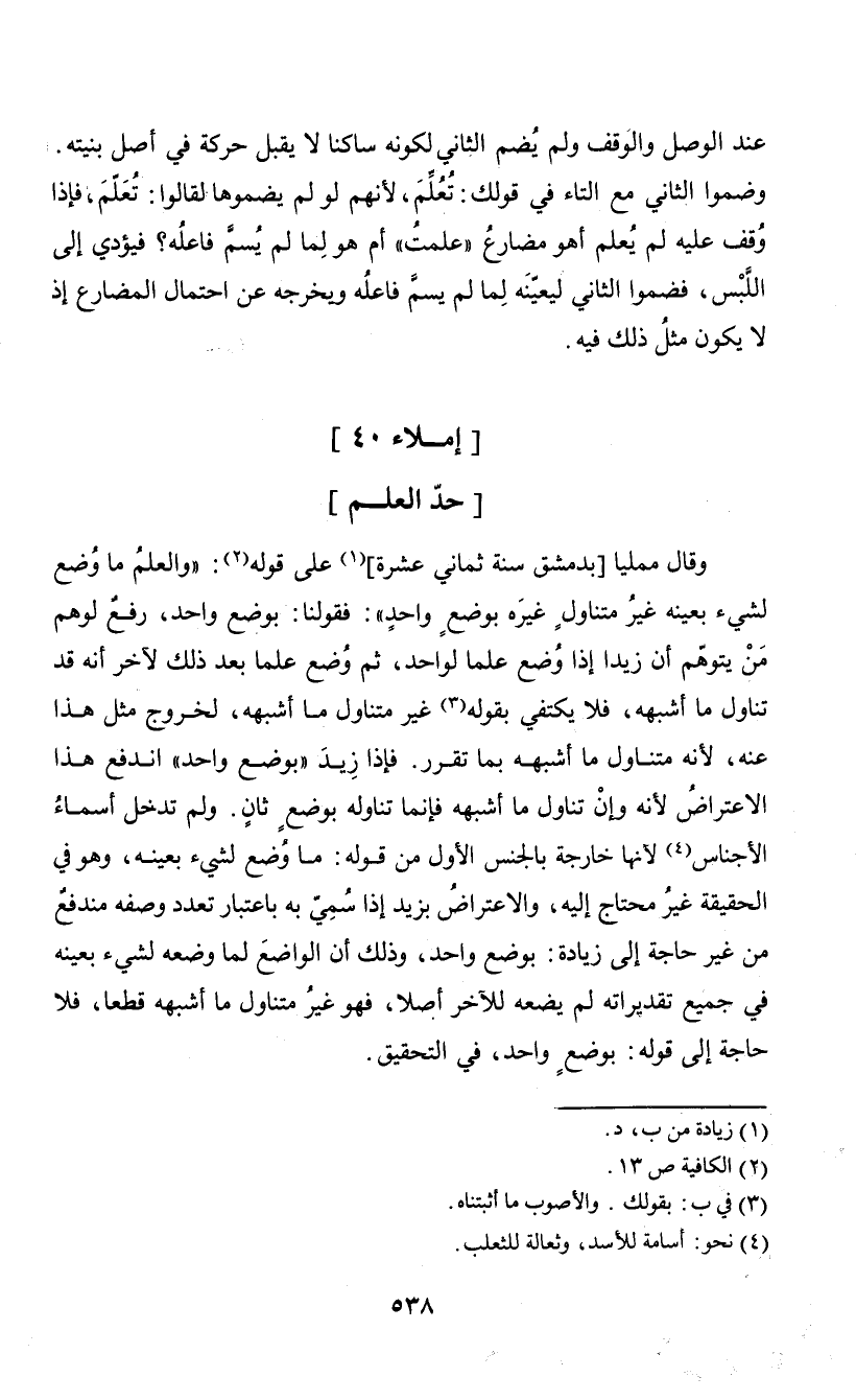 وقال مملياً [بدمشق سنة ثماني عشرة] (¬1) على قوله (¬2): "والعلم ما وضع لشيء بعينه غير متناول غيره بوضع واحد": فقولنا: بوضع واحد، ورفع لوهم من يتوهم أن زيدا إذا وضع علما لواحد، ثم وضع علما بعد ذلك لآخر أنه قد تناول ما أشبهه، فلا يكتفي بقوله (¬3) غير متناول ما أشبهه، لخروج مثل هذا عنه، لأنه متناول ما أشبهه بما تقرر. فإذا زيد "بوضع واحد" اندفع هذا الاعتراض لأنه وإن تناول ما أشبهه فإنما تناوله بوضع ثان. ولم تدخل أسماء الأجناس (¬4) لأنها خارجة بالجنس الأول من قوله: ما وضع لشيء بعينه، وهو في الحقيقة غير محتاج إليه، والاعتراض بزيد إذا سمي به باعتبار تعدد وصفه مندفع من غير حاجة إلى زيادة: بوضع واحد، وذلك أن الواضع لما وضعه لشيء بعينه في جميع تقديراته لم يضعه للآخر أصلا، فهو غير متناول ما أشبهه قطعا، فلا حاجة إلى قوله: بوضع واحد، في التحقيق.
