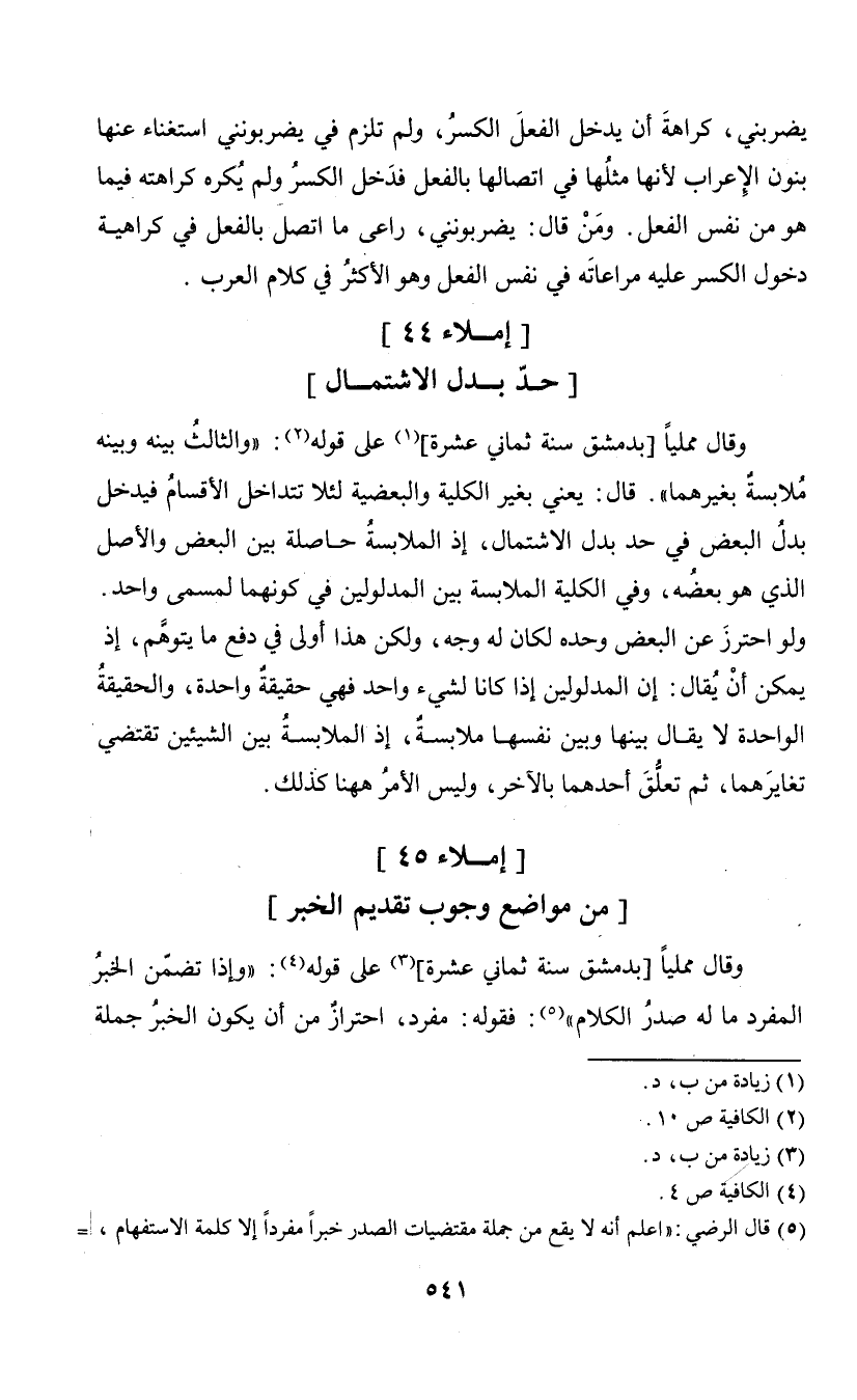 وقال مملياً [بدمشق سنة ثماني عشرة] (¬1) على قوله (¬2): "والثالث بينه وبينه ملابسة بغيرهما". قال: يعني بغير الكلية والبعضية لئلا تتداخل الأقسام فيدخل بدل البعض في حد بدل الاشتمال، إذ الملابسة حاصلة بين البعض والأصل الذي هو بعضه، وفي الكلية الملابسة بين المدلولين في كونهما لمسمى واحد. ولو احترز عن البعض وحده لكان له وجه، ولكن هذا أولى في دفع ما يتوهم، إذ يمكن أن يقال: إن المدلولين إذا كانا لشيء واحد فهي حقيقة واحدة، والحقيقة الواحدة لا يقال بينها وبين نفسها ملابسة، إذ الملابسة بين الشيئين تقتضي تغايرهما، ثم تعلق أحدهما بالآخر، وليس الأمر ههنا كذلك.