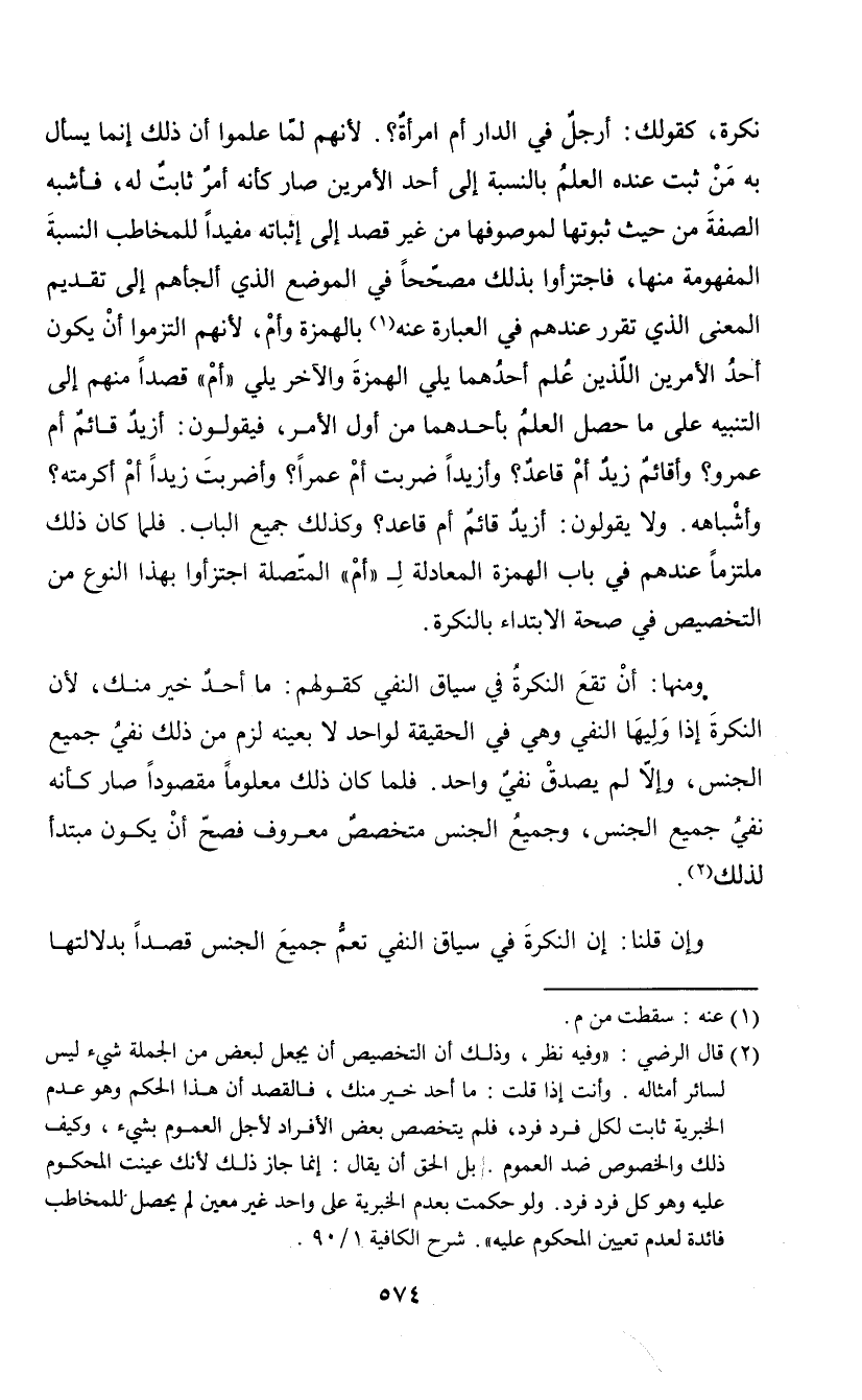 (¬2) قال الرضي: "وفيه نظر، وذلك أن التخصيص أن يجعل لبعض من الجملة شيء ليس لسائر أمثاله. وأنت إذا قلت: ما أحد خير منك، فالقصد أن هذا الحكم وهو عدم الخبرية ثابت لكل فرد فرد، فلم يتخصص بعض الأفراد لأجل العموم بشيء، وكيف ذلك والخصوص ضد العموم. بل الحق أن يقال: إنما جاز ذلك لأنك عينت المحكوم عليه وهو كل فرد فرد. ولو حكمت بعدم الخبرية على واحد غير معين لم يحصل للمخاطب فائدة لعدم تعيين المحكوم" شرح الكافية 1/ 90.