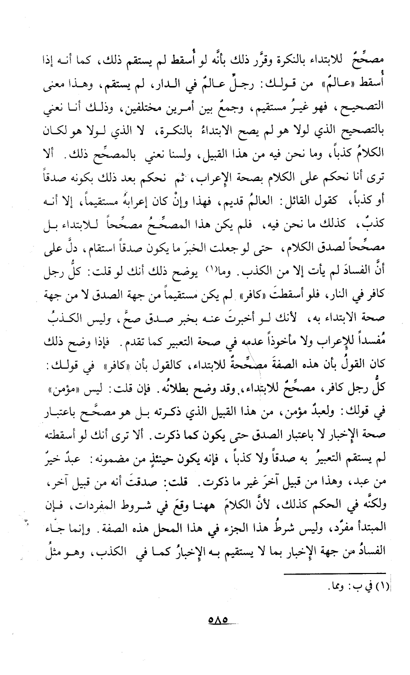 مصحح للابتداء بالنكرة وقرر ذلك بأنه لو أسقط لم يستقم ذلك، كما أنه إذا أسقط "عالم" من قولك: رجل عالم في الدار، لم يستقم، وهذا معنى التصحيح، فهو غير مستقيم، وجمع بين أمرين مختلفين، وذلك أنا نعني بالتصحيح الذي لولا هو لم يصح الابتداء بالنكرة، لا الذي لولا هو لكان الكلام كذبا، وما نحن فيه من هذا القبيل، ولسنا نعني بالمصحح ذلك. ألا ترى أنا نحكم على الكلام بصحة الإعراب، ثم نحكم بعد ذلك بكونه صدقا أو كذبا، كقول القائل: العالم قديم، فهذا وإن كان إعرابه مستقيما، إلا أنه كذب، كذلك ما نحن فيه، فلم يكن هذا المصحح مصححا للابتداء بل مصححا لصدق الكلام، حتى لو جعلت الخبر ما يكون صدقا استقام، دل على أن الفساد لم يأت إلا من الكذب. وما (¬1) يوضح ... ذلك أنك لو قلت: كل رجل كافر في النار، فلو أسقطت "كافر" لم يكن مستقيما من جهة الصدق لا من جهة صحة الابتداء به، لأنك لو أخبرت عنه بخبر صدق صح، وليس الكذب مفسدا للإعراب ولا مأخوذا عدمه في صحة التعبير كما تقدم. فإذا وضح ذلك كان القول بأن هذه الصفة مصححة للابتداء، كالقول بأن "كافر" في قولك: كل رجل كافر، مصحح للابتداء، وقد وضح بطلانه. فإن قلت: ليس "مؤمن" في قولك: ولعبد مؤمن، من هذا القبيل الذي ذكرته بل هو مصحح باعتبار صحة الإخبار لا باعتبار الصدق حتى يكون كما ذكرت. ألا ترى أنك لو أسقطته لم يستقم التعبير به صدقا ولا كذبا، فإنه يكون حينئذ من مضمونه: عبد خير من عبد، وهذا من قبيل اخر غير ما ذكرت. قلت: صدقت أنه من قبيل اخر، ولكنه في الحكم كذلك، لأن الكلام ههنا وقع في شروط المفردات، فإن المبتدأ مفرد، وليس شرط هذا الجزء في هذا المحل هذه الصفة. وإنما جاء الفساد من جهة الإخبار بما لا يستقيم به الإخبار كما في الكذب، وهو مثل